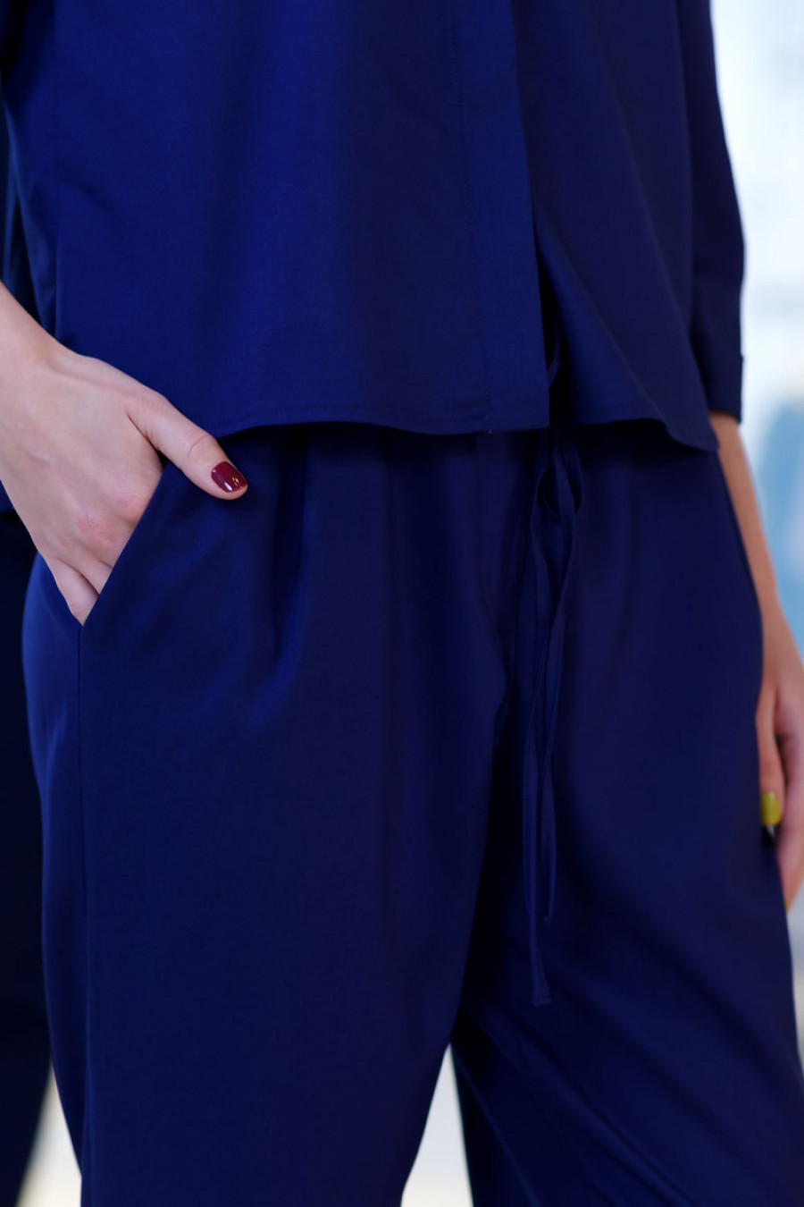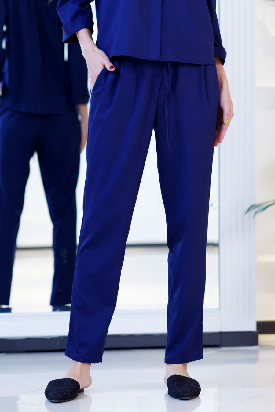Брюки свободного кроя из легкой ткани. Модель классической длины с зауженными книзу брючинами. В боковых швах выполнены втачные карманы. На поясе кулиска из репсовой ленты.