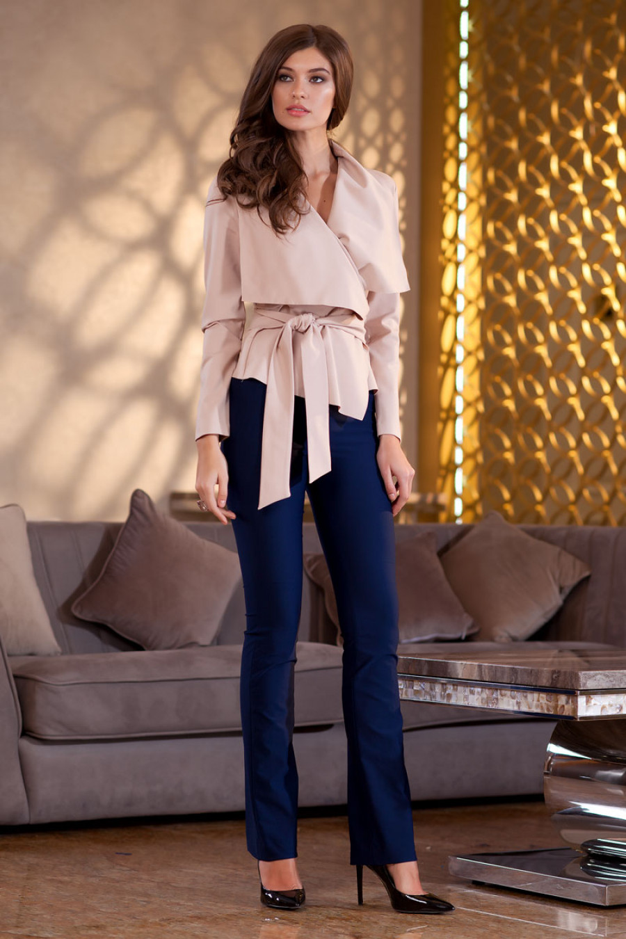 Элегантные брюки из однотонной ткани костюмной группы. Модель средней посадки с застежкой на молнию и две пуговицы. В боковых швах имитация карманов. Сзади имитация карманов с листочкой. Брючины чуть расширены книзу. Впереди и сзади заутюжены стрелки. На поясе имеются шлевки.