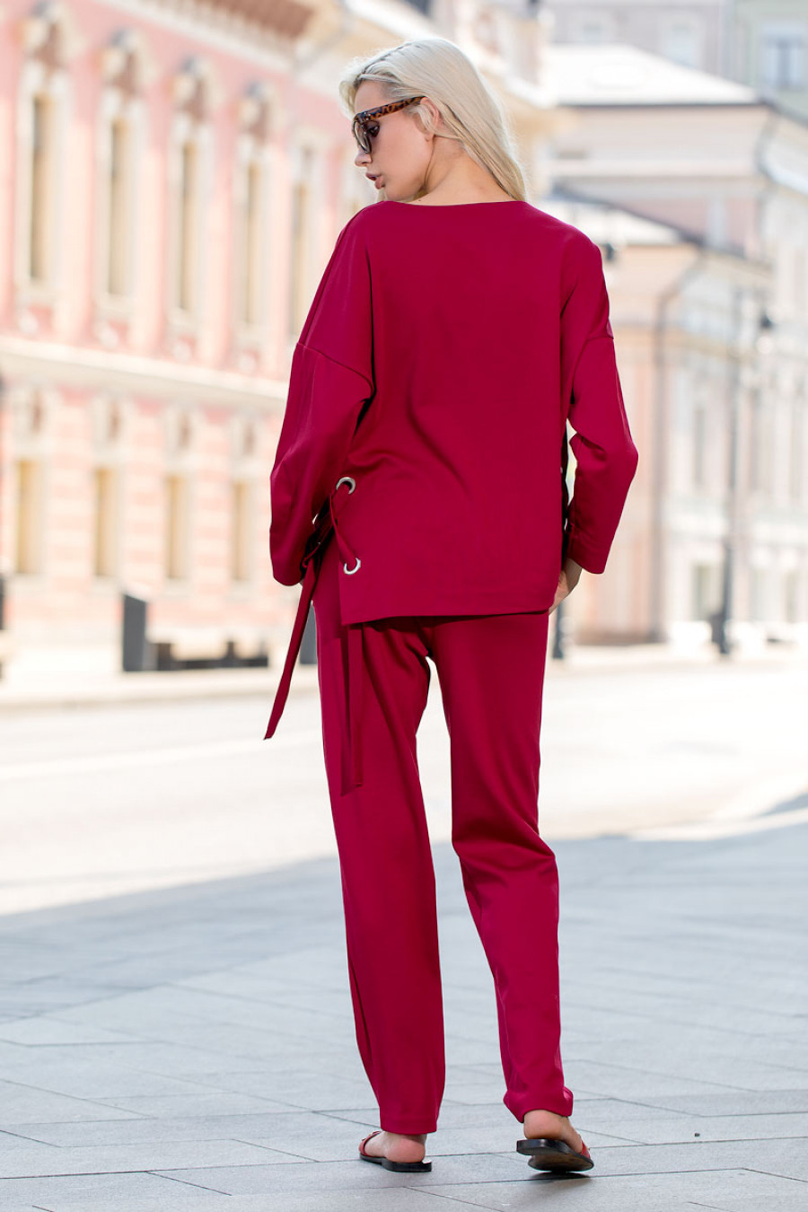 Стильные брюки из однотонного джерси. Модель средней посадки, брючины с заужением к низу со стрелками впереди. В боковых швах выполнены карманы. Пояс с широкой резинкой.