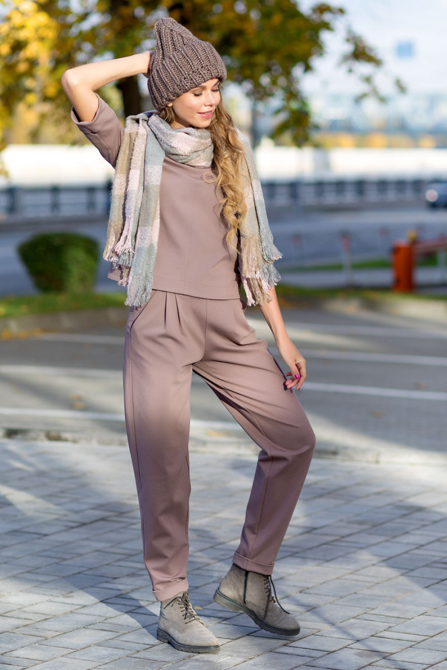 Спортивные брюки из однотонного джерси. Модель на поясе с зауженными книзу брючинами. В боковых швах выполнены карманы. Сзади застежка на потайную молнию.