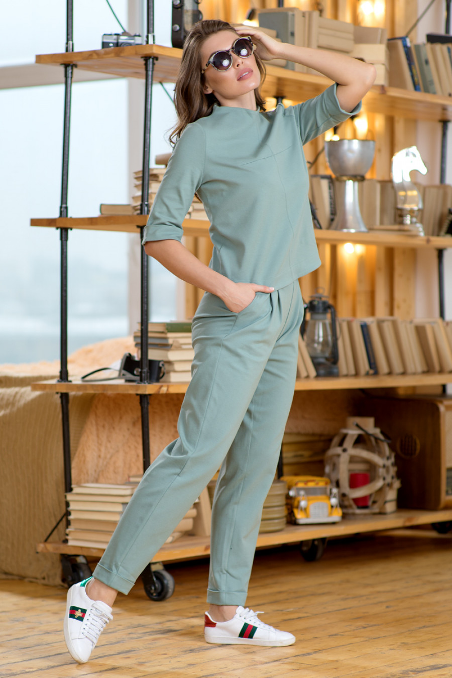 Спортивные брюки из однотонного джерси. Модель на поясе с зауженными книзу брючинами. В боковых швах выполнены карманы. Сзади застежка на потайную молнию.