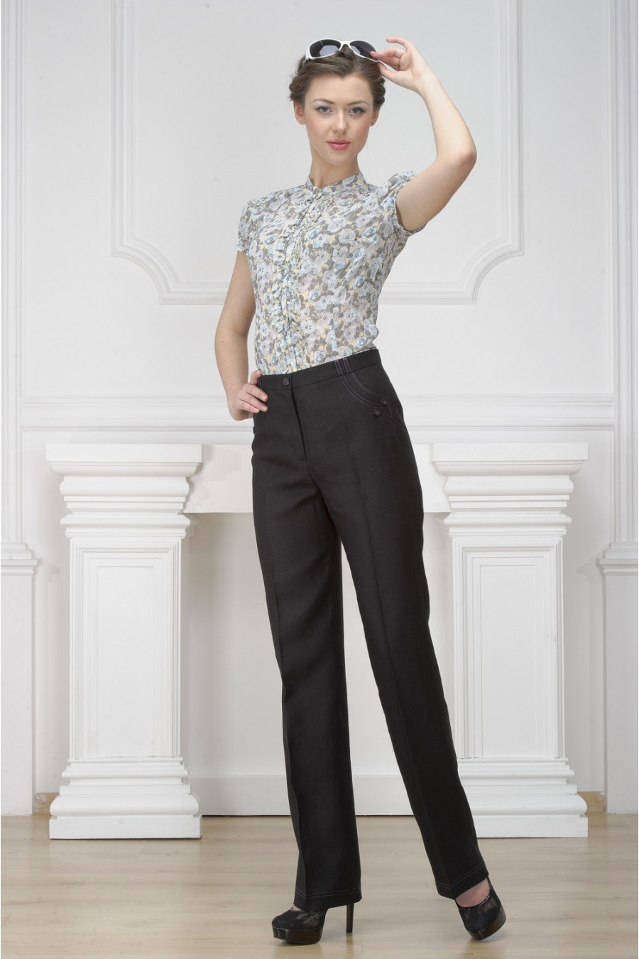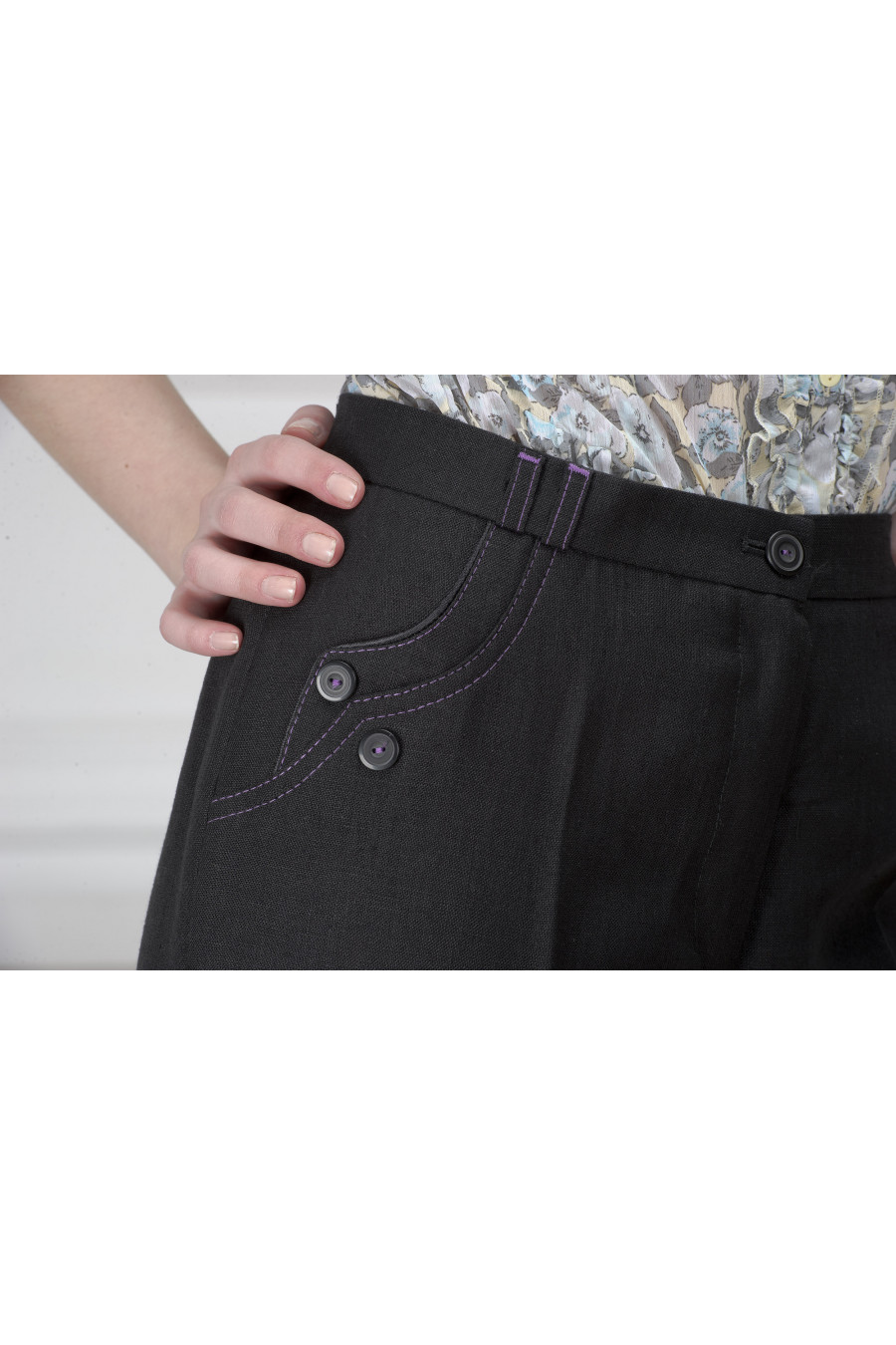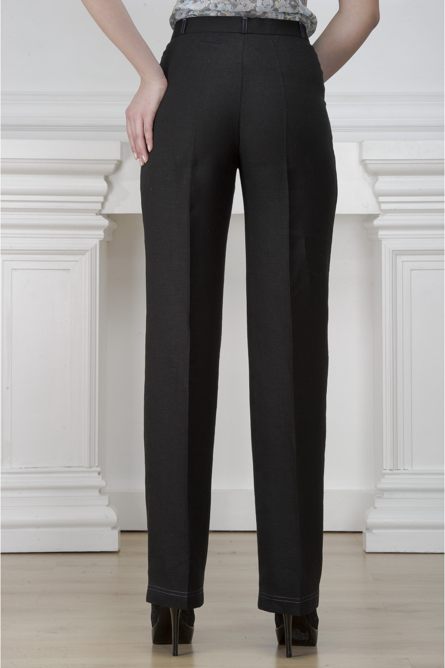Брюки черные на высокой посадке прямые от бедра с фиолетовой отстрочкой - «Графит»