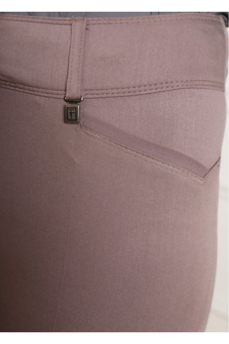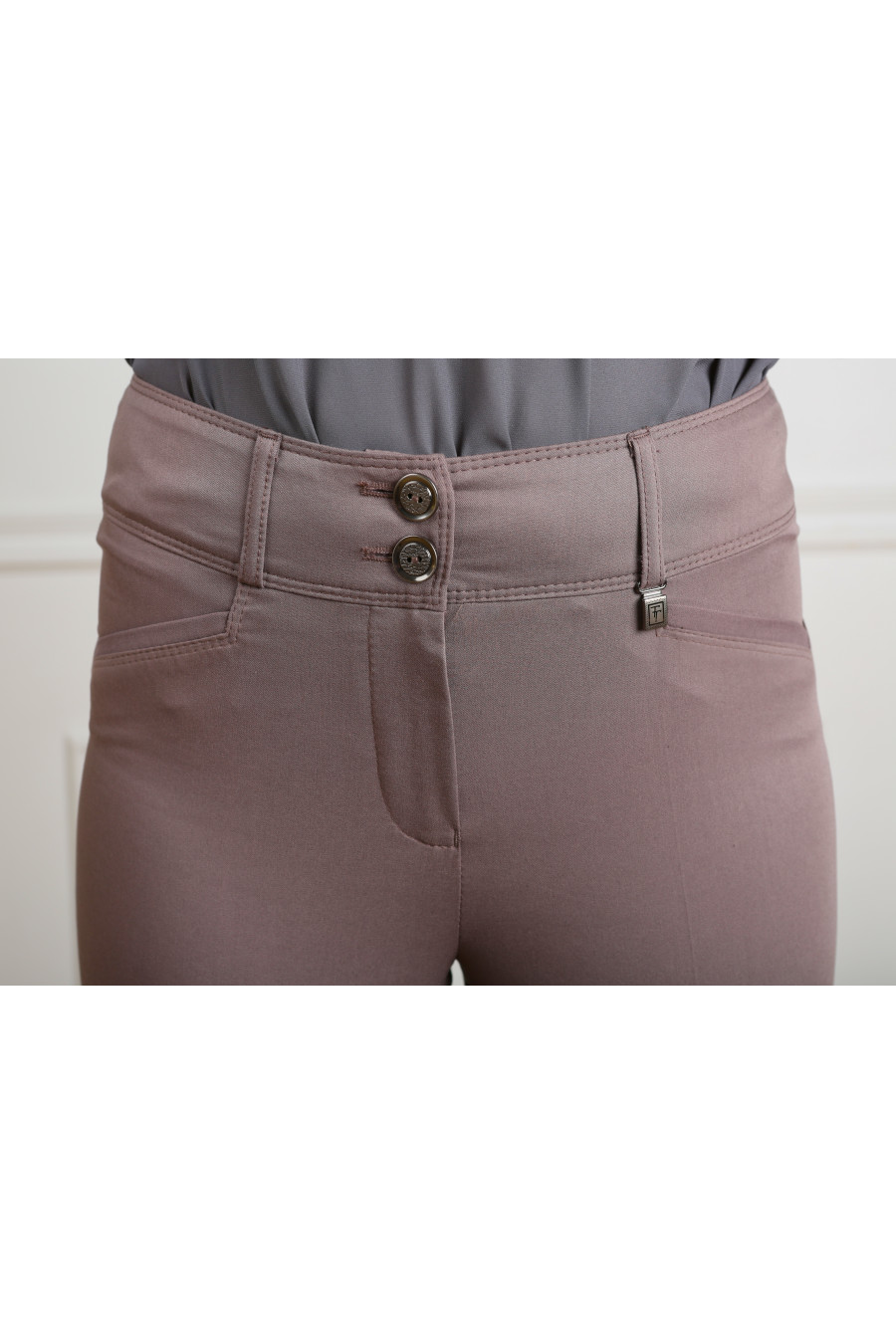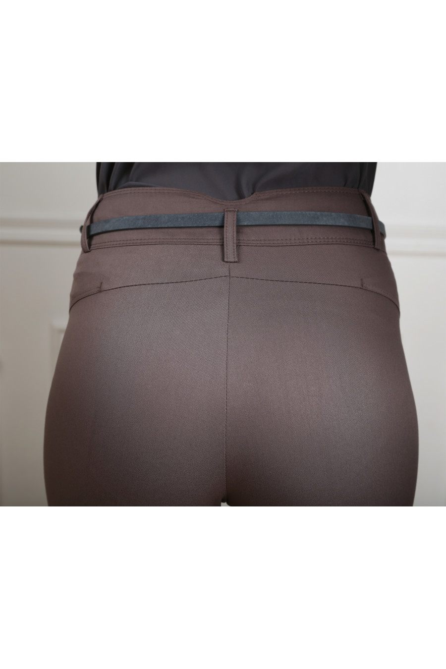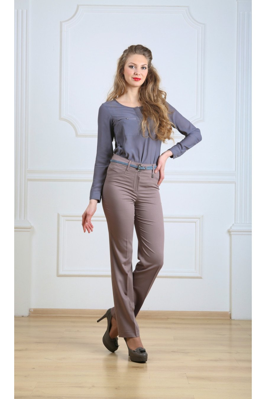 Брюки какао на средней посадке с карманами и кокеткой с отделкой - «Шлифованная вискоза»