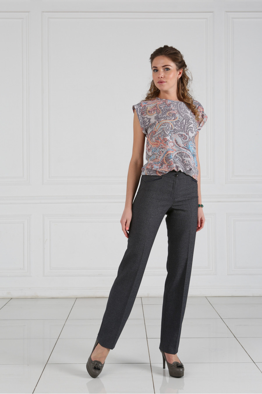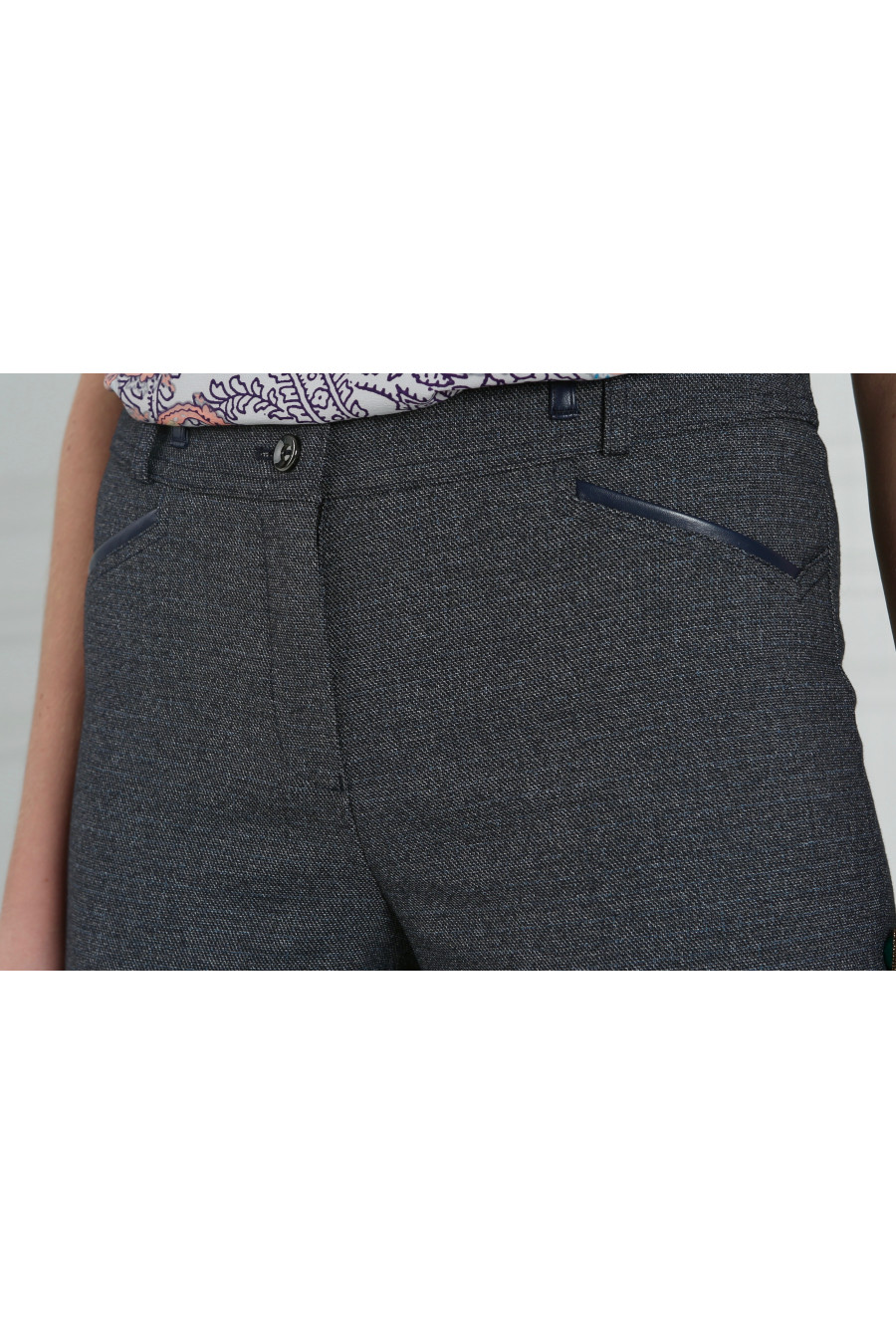 Брюки на средней посадке зауженные к низу с отделкой из кожи "Твид" серо-синие Брюки на средней посадке зауженные к низу с отделкой из кожи "Твид" серо-синие