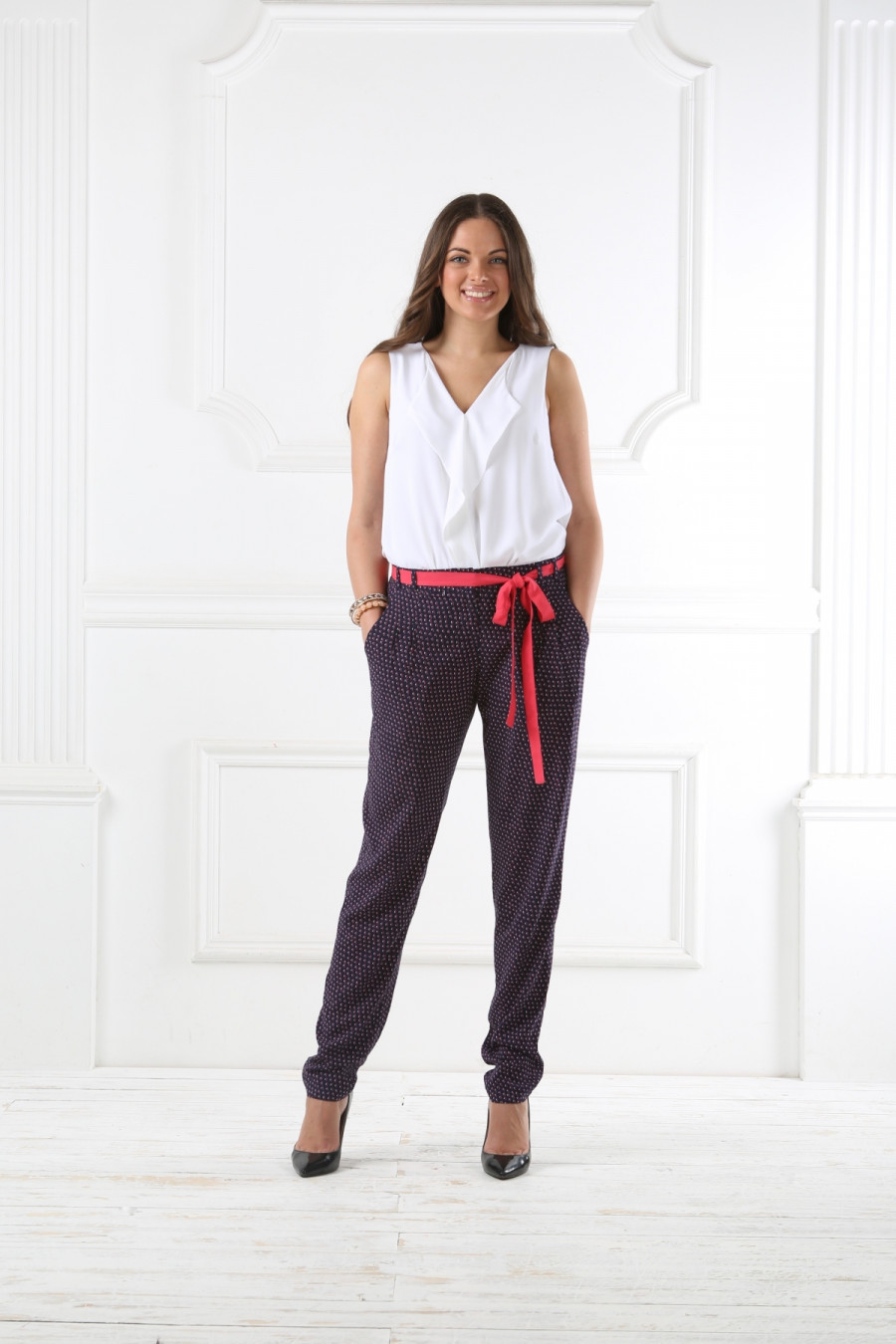 Брюки на средней посадке, на резинке с поясом "Штапель"Дождик" сине-розовые