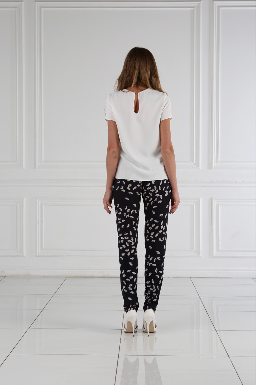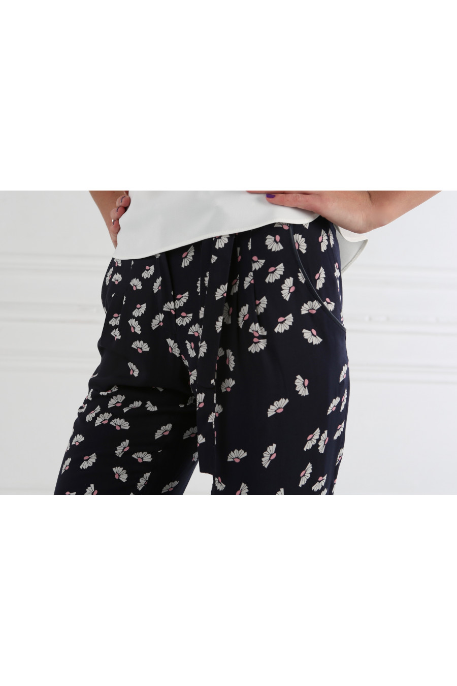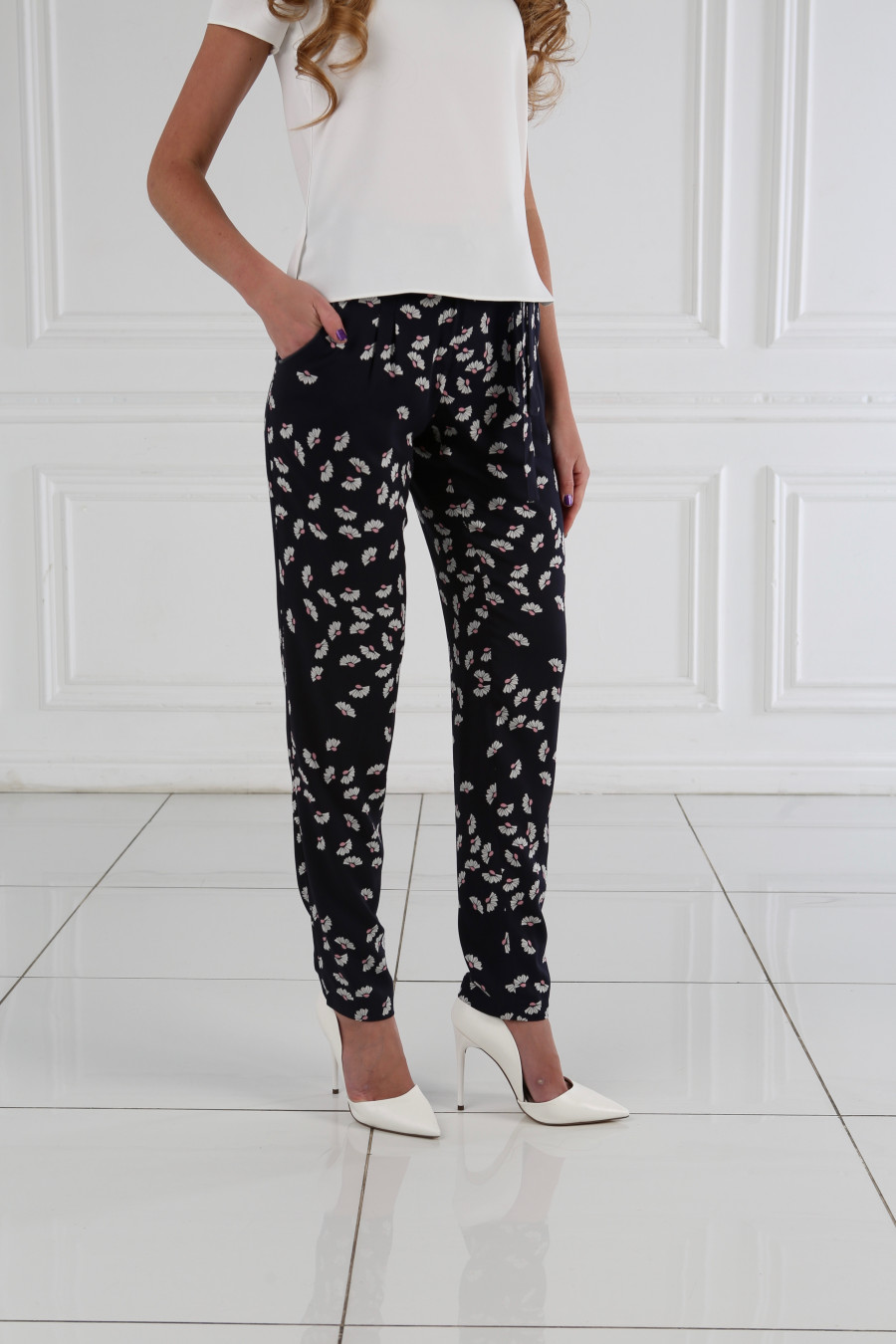 Брюки темно-синие на средней посадке на резинке с отделкой из кожи "Штапель" "Ромашки"