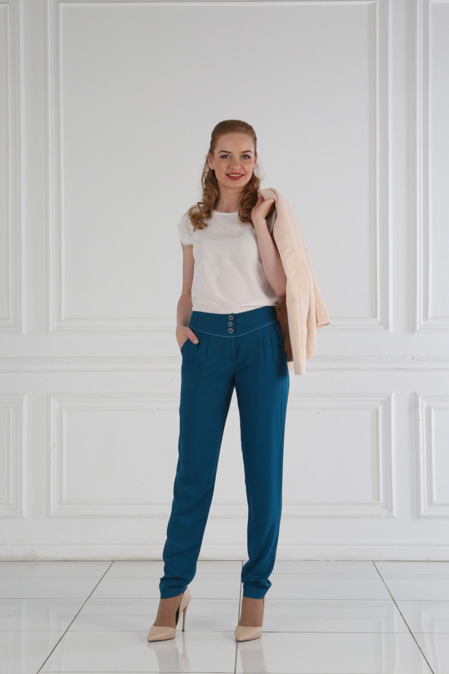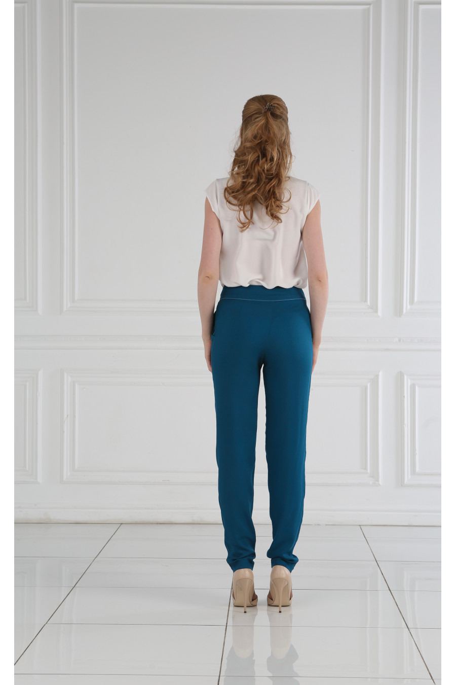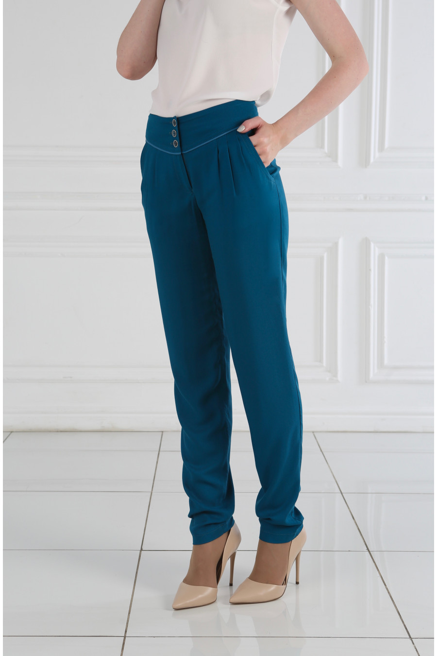 Брюки бирюзовые на средней посадке "Бананы" "Штапель гладкий" с отделкой из кожи