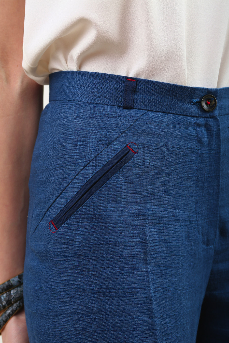 Брюки на высокой посадке зауженные к низу с отделкой из штапеля. Лён,синий