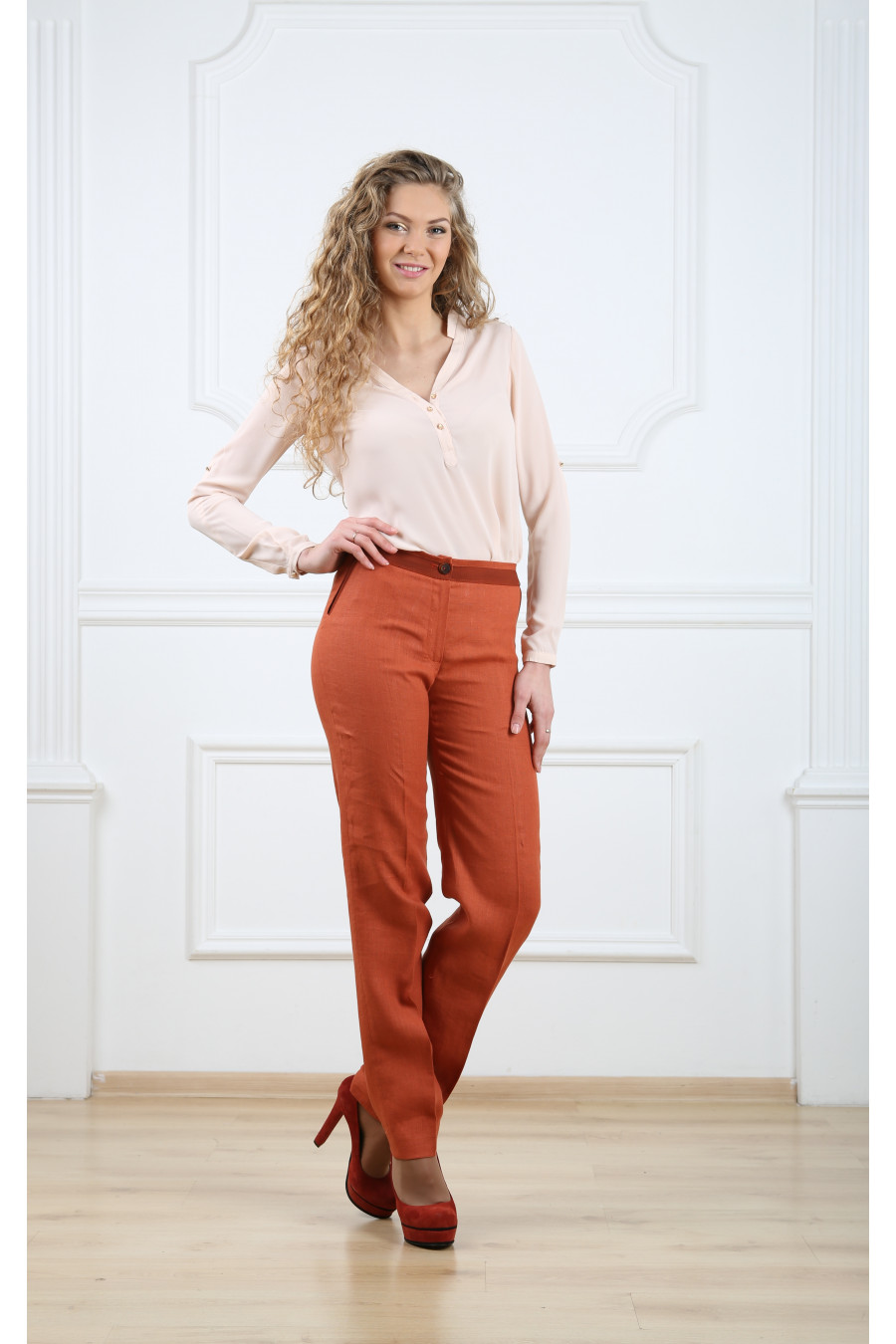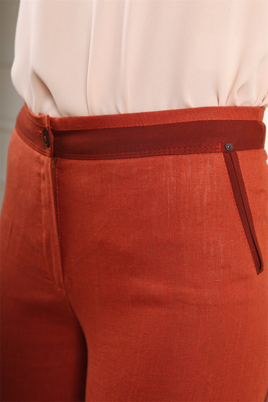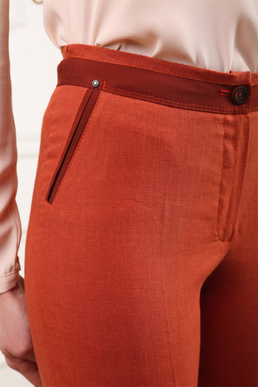 Брюки на средней посадке зауженные с карманами и отделкой из штапеля. Оранж»