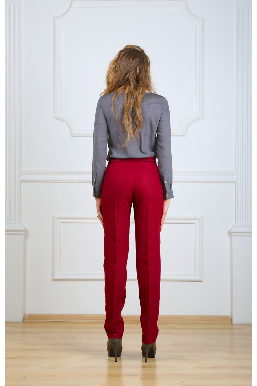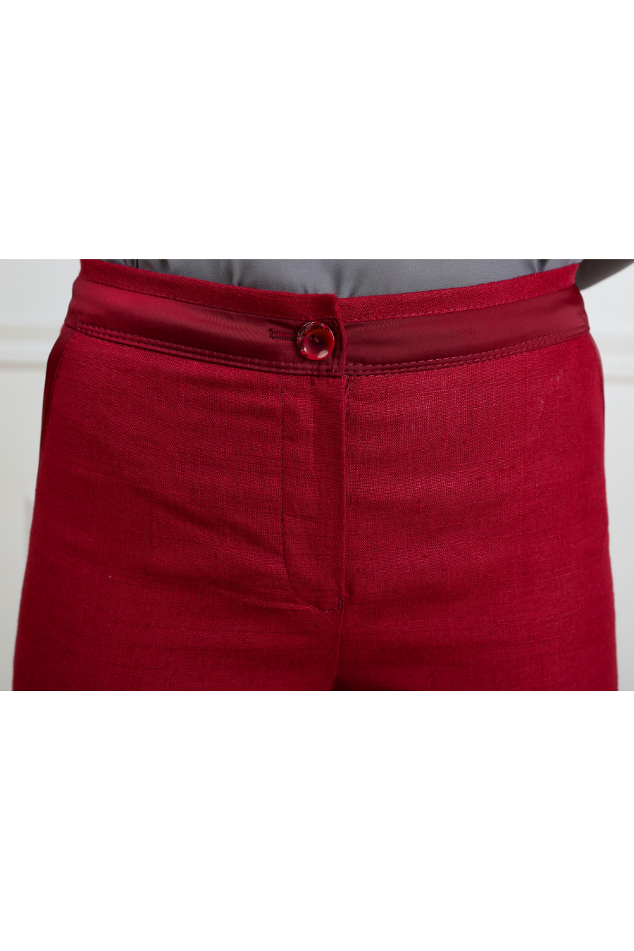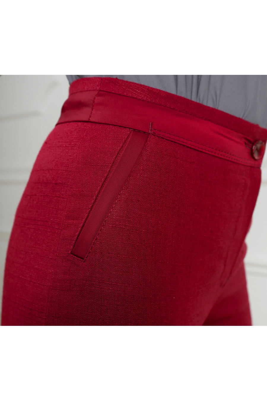 Брюки на средней посадке зауженные с карманами и отделкой из французского шёлка. Лён вишня