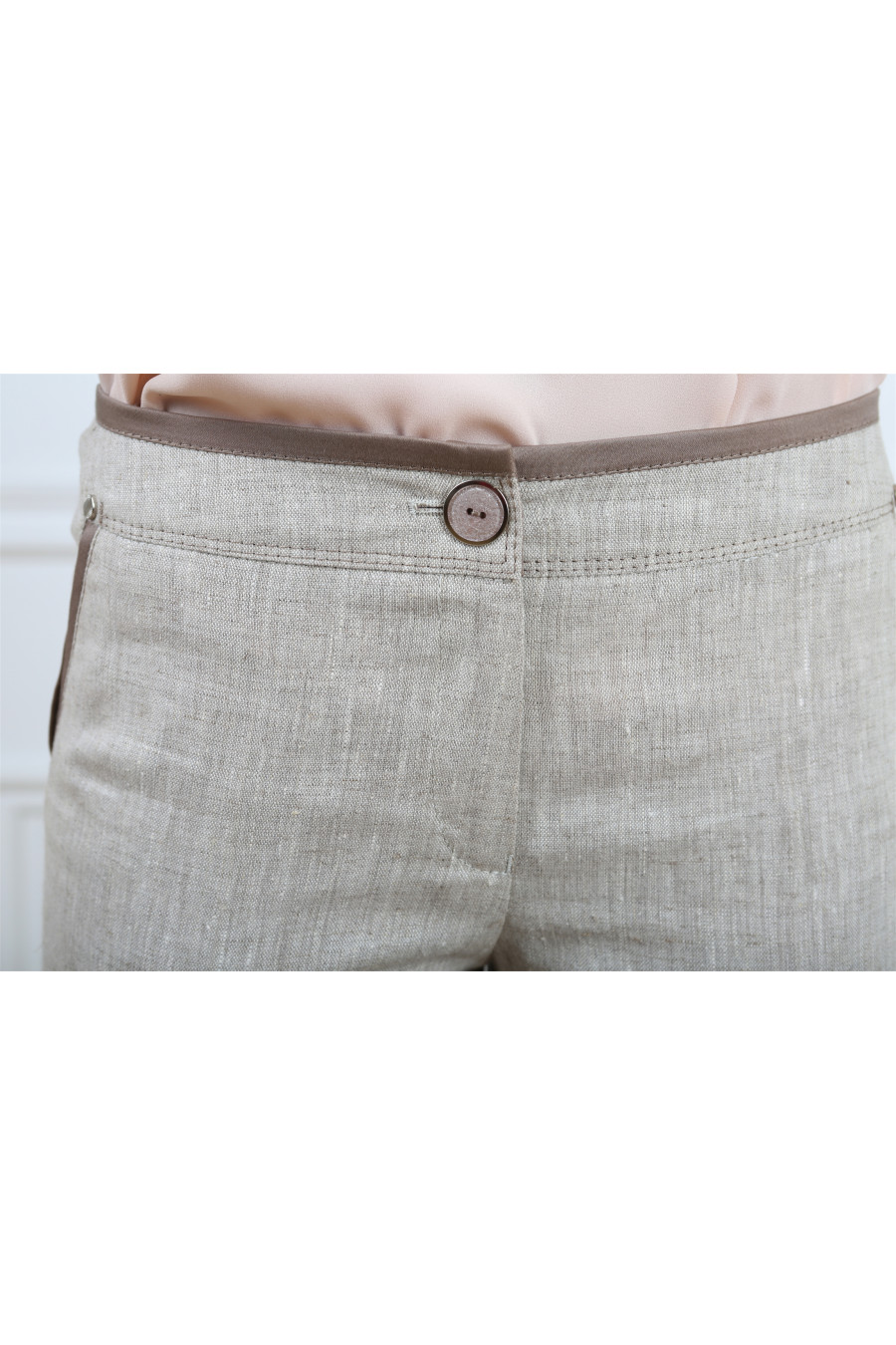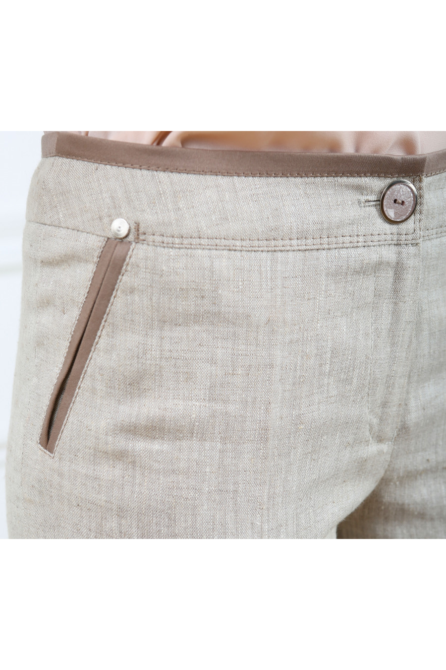 Брюки на средней посадке зауженные к низу с отделкой из хлопка 7/8. Натуральный лён