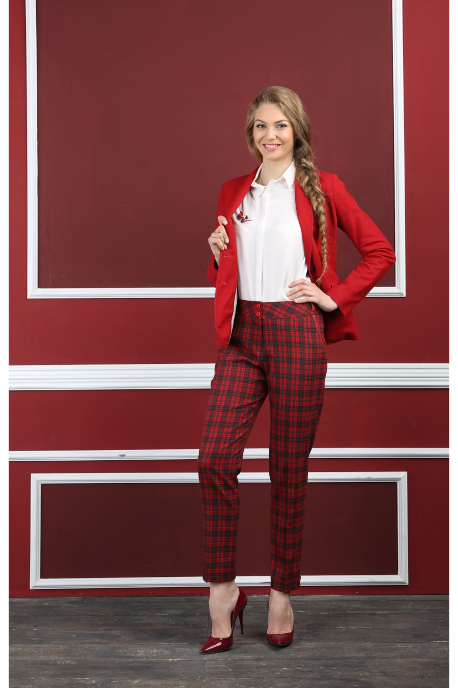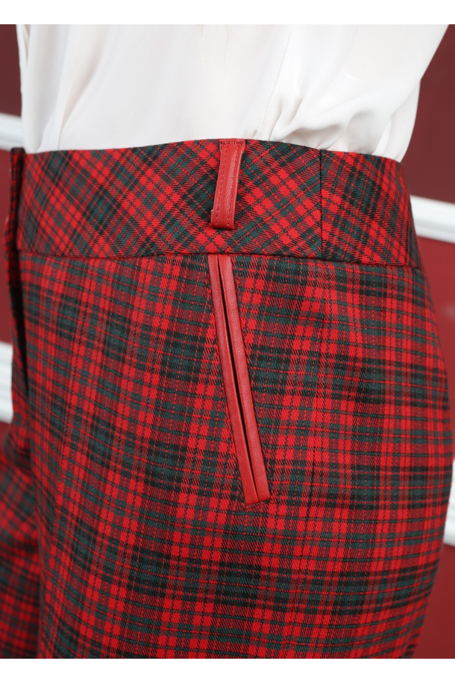 Брюки на средней посадке зауженный к низу 7/8 «Клетка Диско» красные