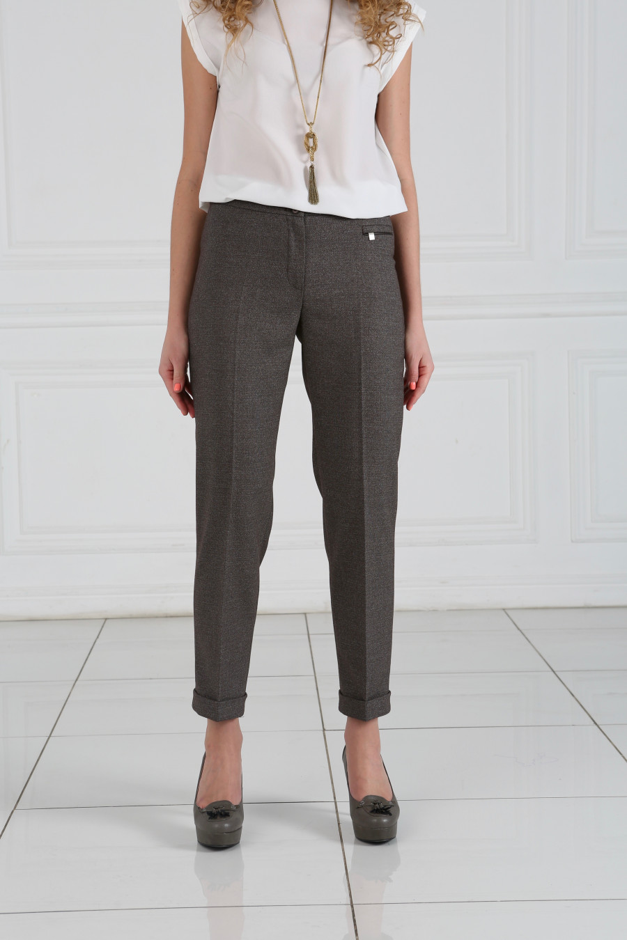 Брюки на средней посадке зауженные к низу с 7/8 "Твид" серо-коричневые с отделкой из кожи