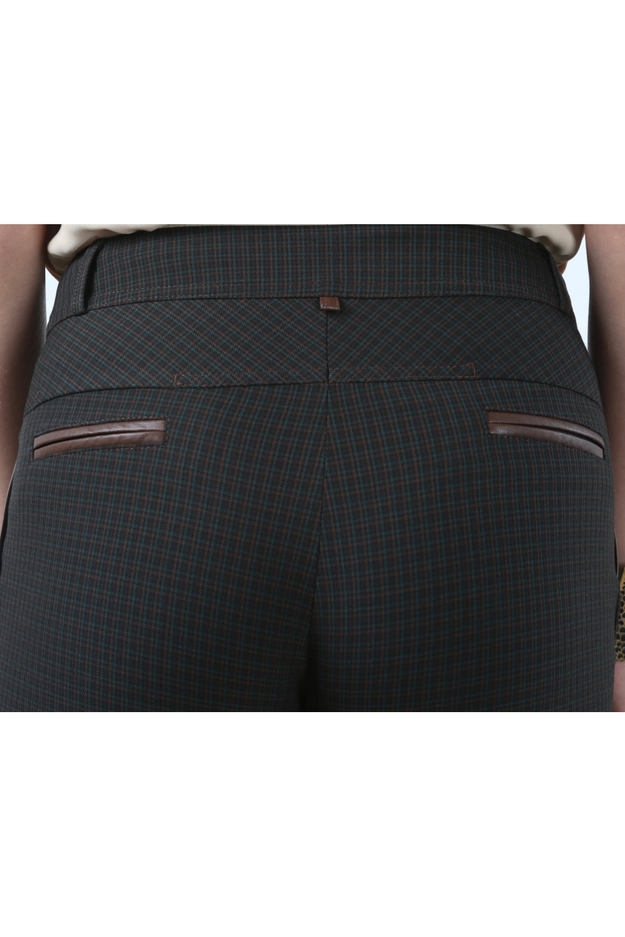 БРЮКИ НА СРЕДНЕЙ ПОСАДКЕ ЗАУЖЕННЫЕ К НИЗУ С ОТДЕЛКОЙ ИЗ РЫЖЕЙ КОЖИ "КЛЕТОЧКА ПЬЕ-ДЕ-КОК"
