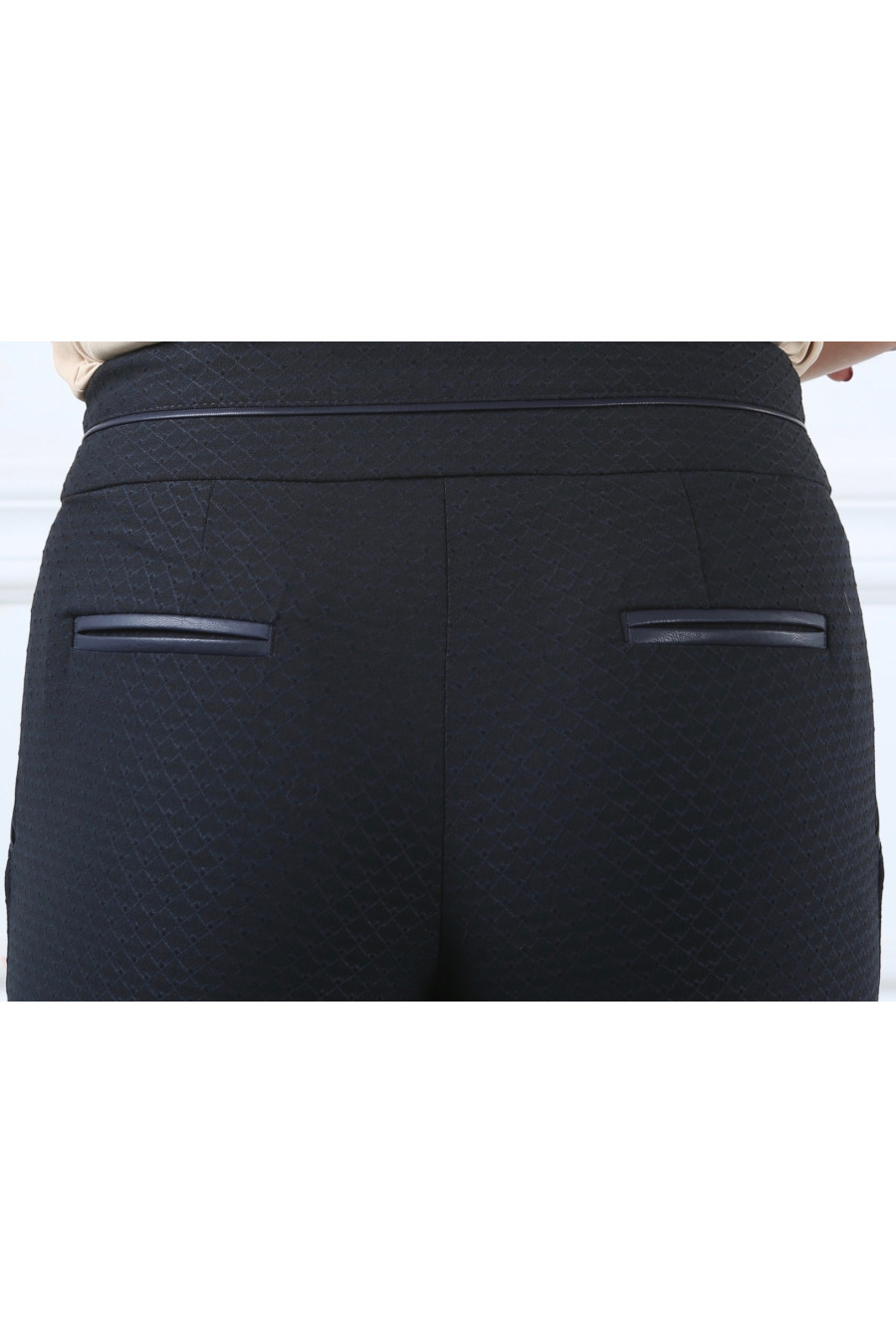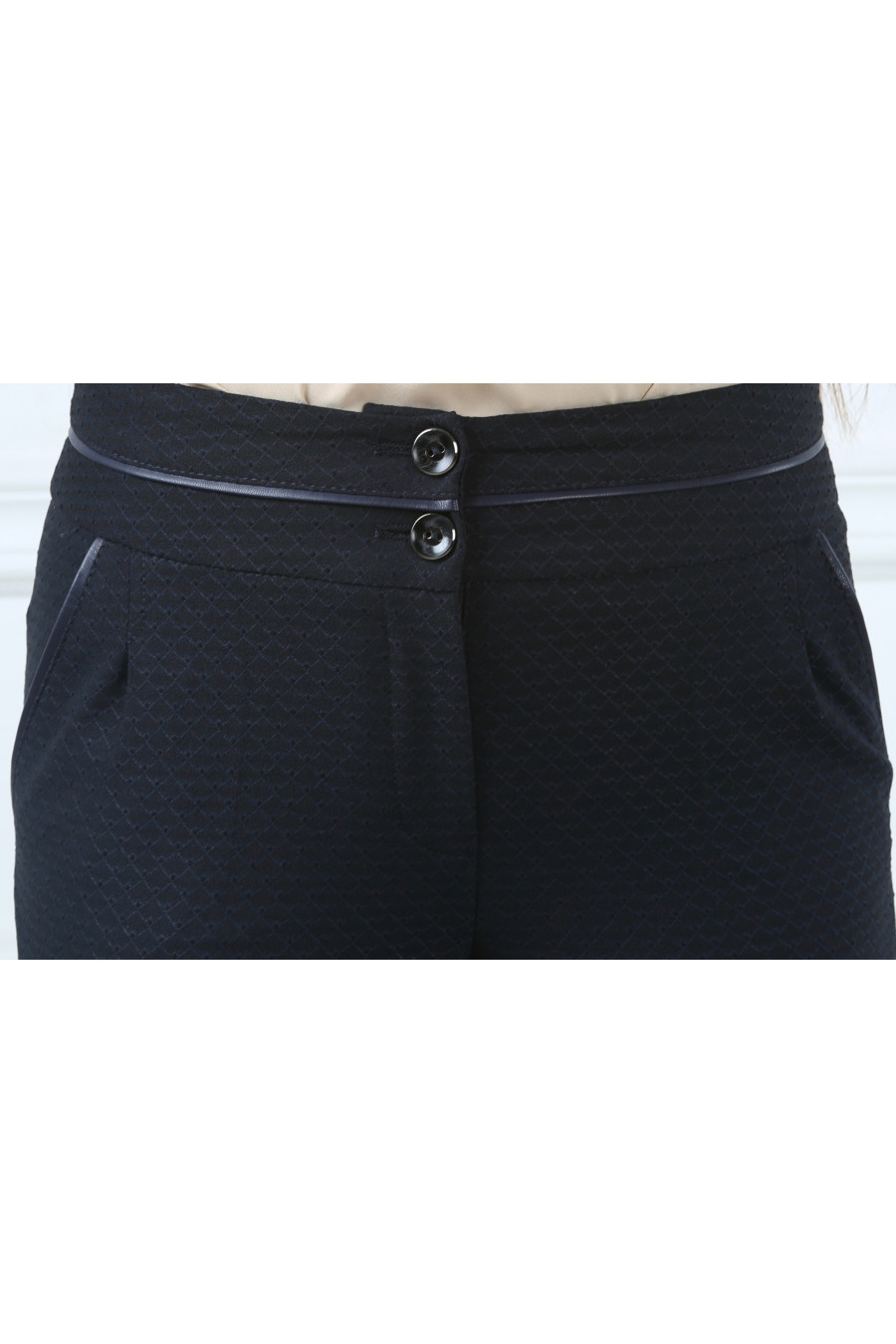 БРЮКИ НА СРЕДНЕЙ ПОСАДКЕ ЗАУЖЕННЫЕ К НИЗУ "НЬЮАРЭС"ТЕМНО-СИНИЕ С ОТДЕЛКОЙ ИЗ КОЖИ