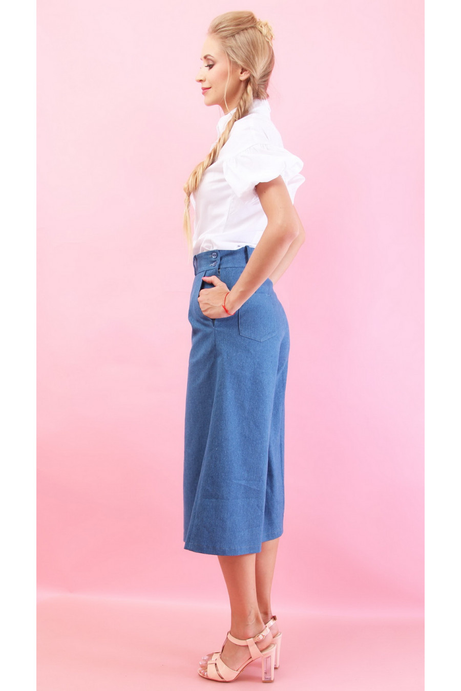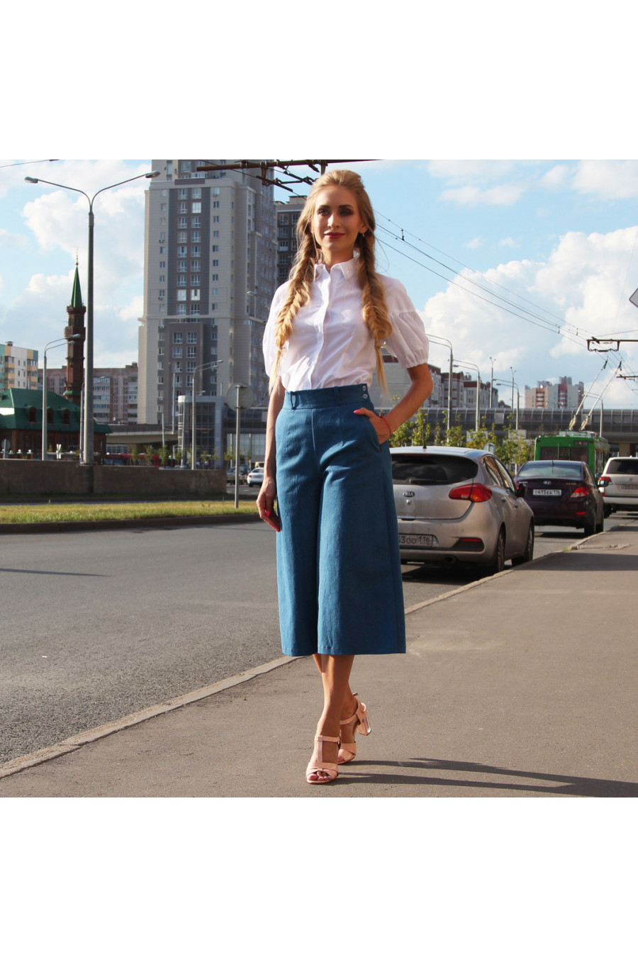 Самая актуальная модель в этом сезоне- кюлоты. Укороченные широкие брюки чуть ниже колена, втачной пояс с шлевками, застежка сбоку на молнию и пуговки.