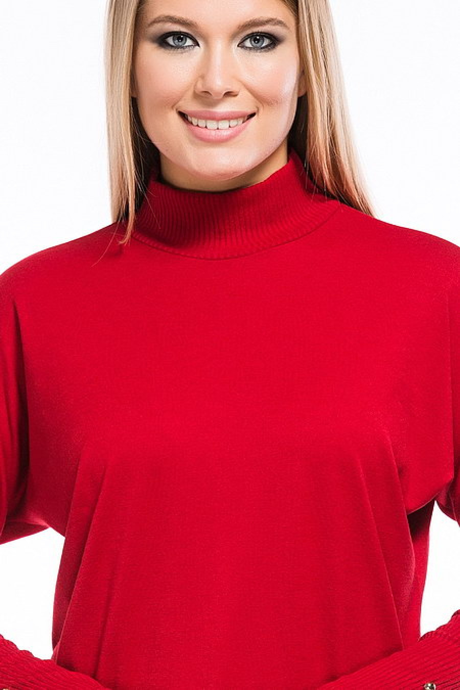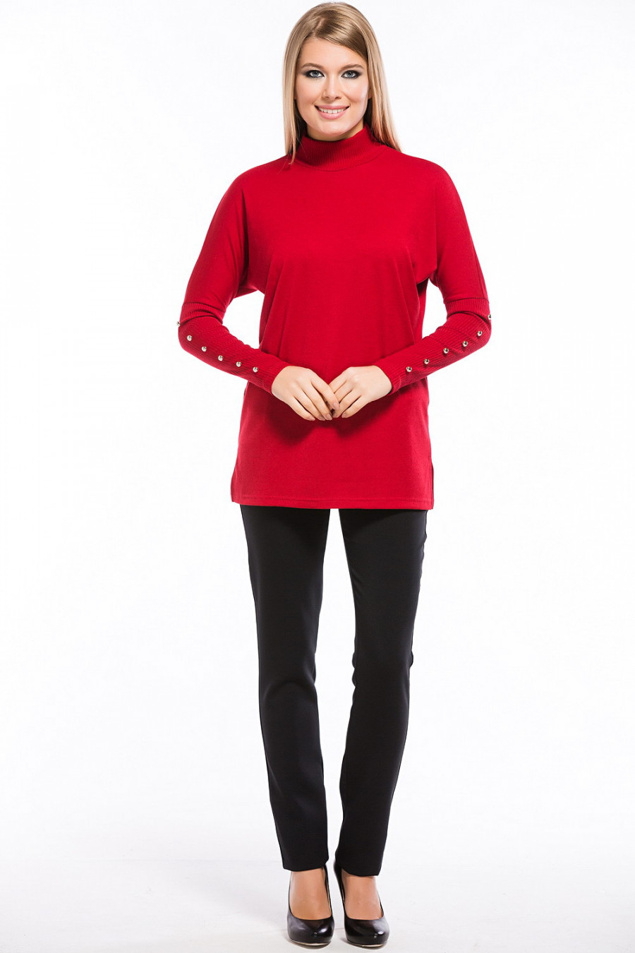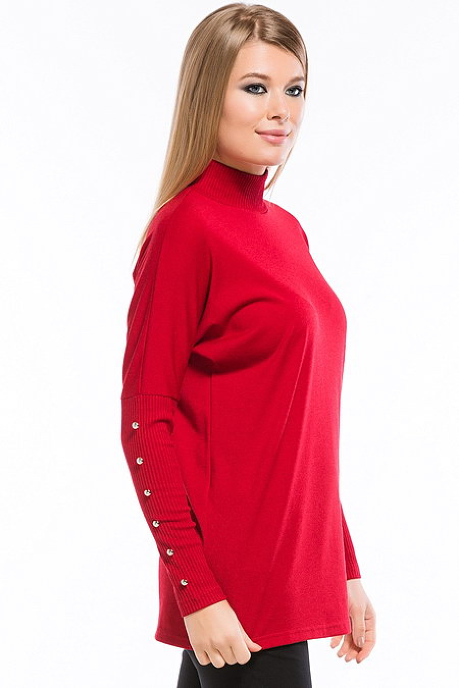 Удлиненный джемпер с горлом. Крой свободный. Рукава украшены декоративными пуговицами.