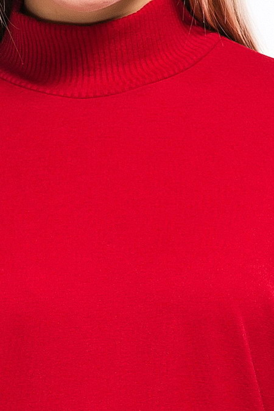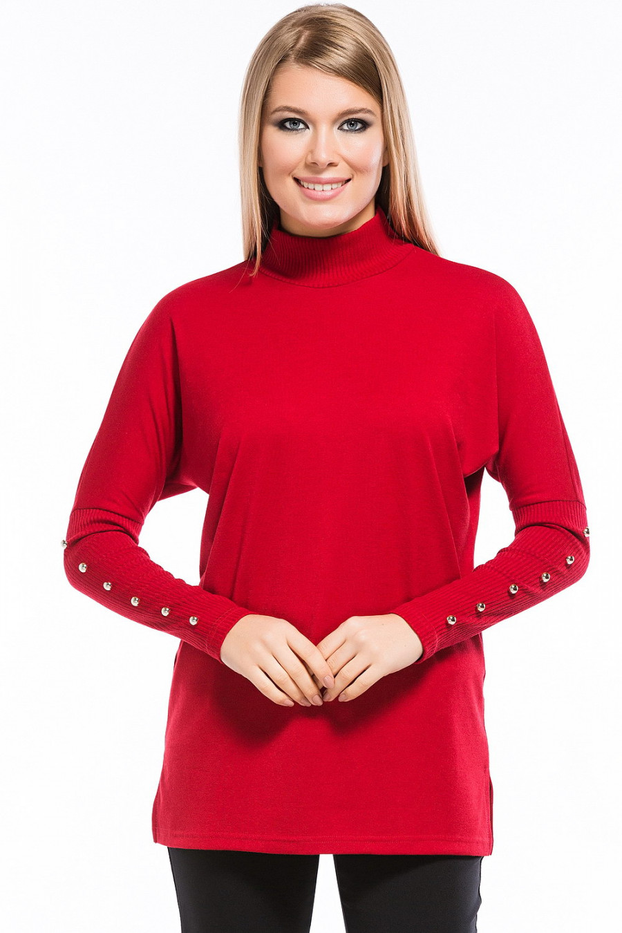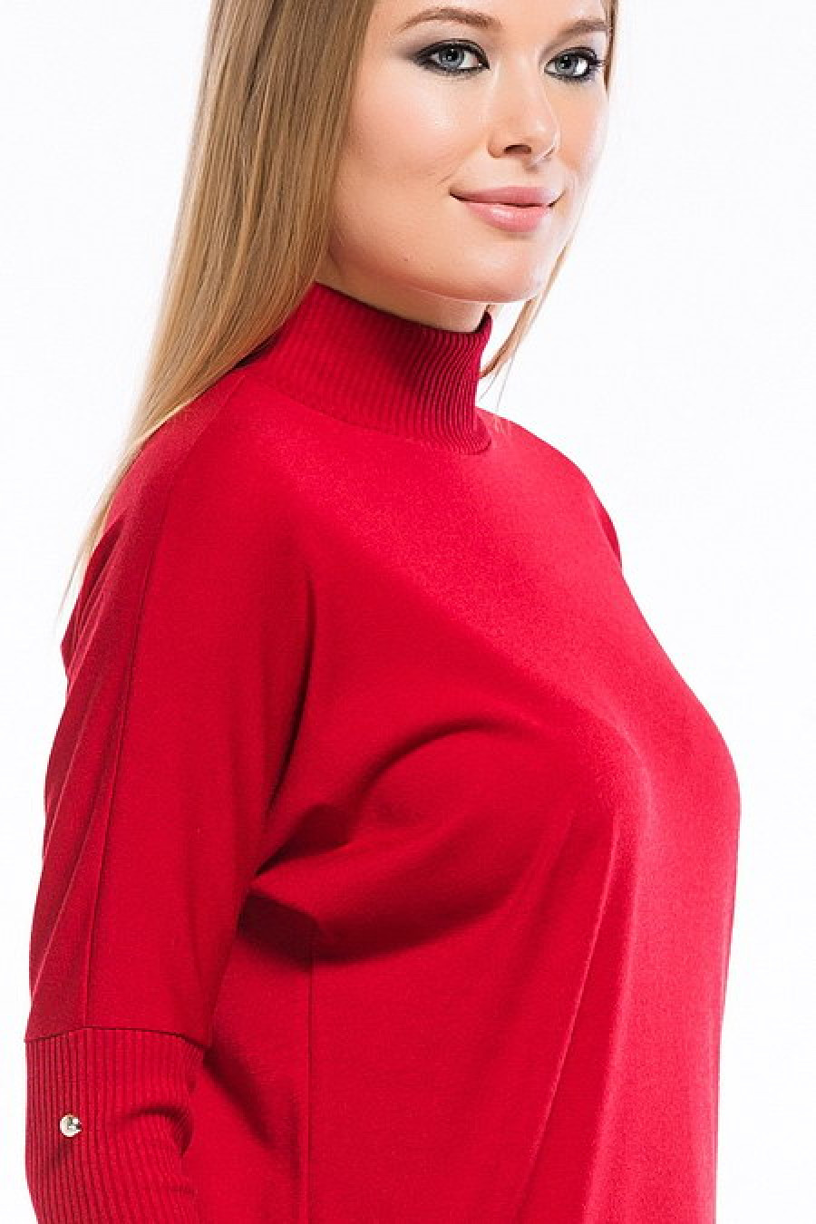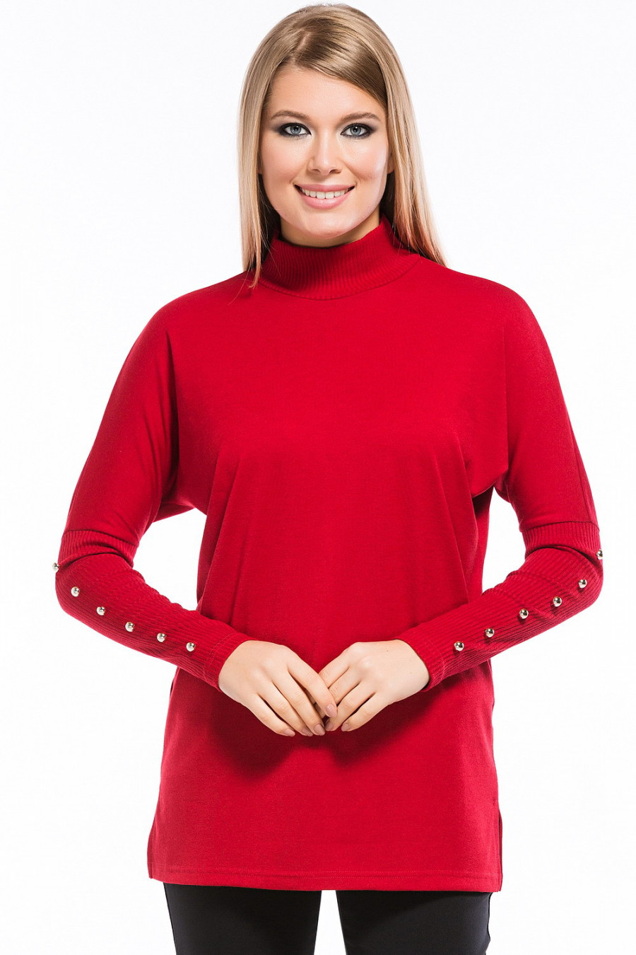 Удлиненный джемпер с горлом. Крой свободный. Рукава украшены декоративными пуговицами.
