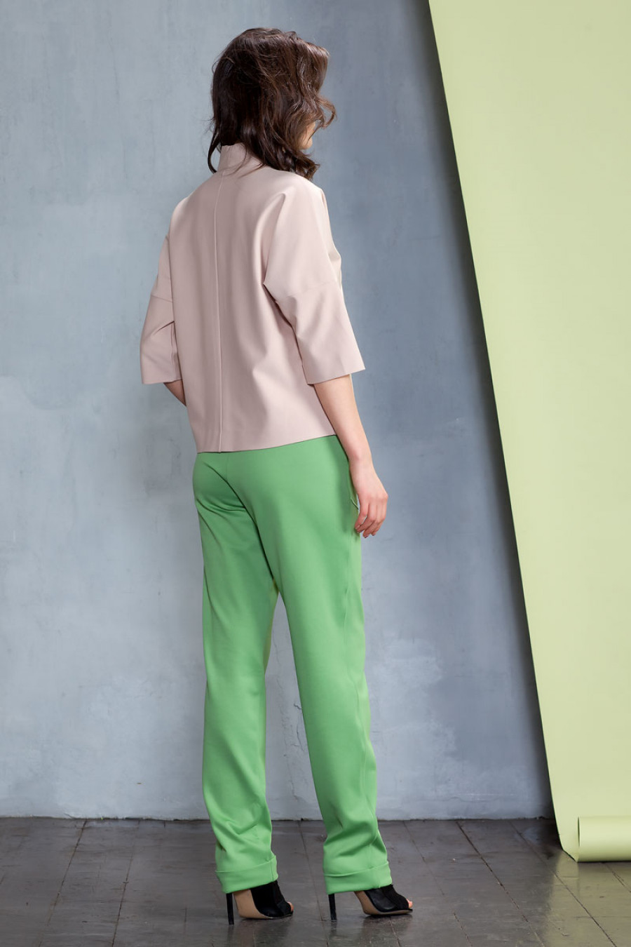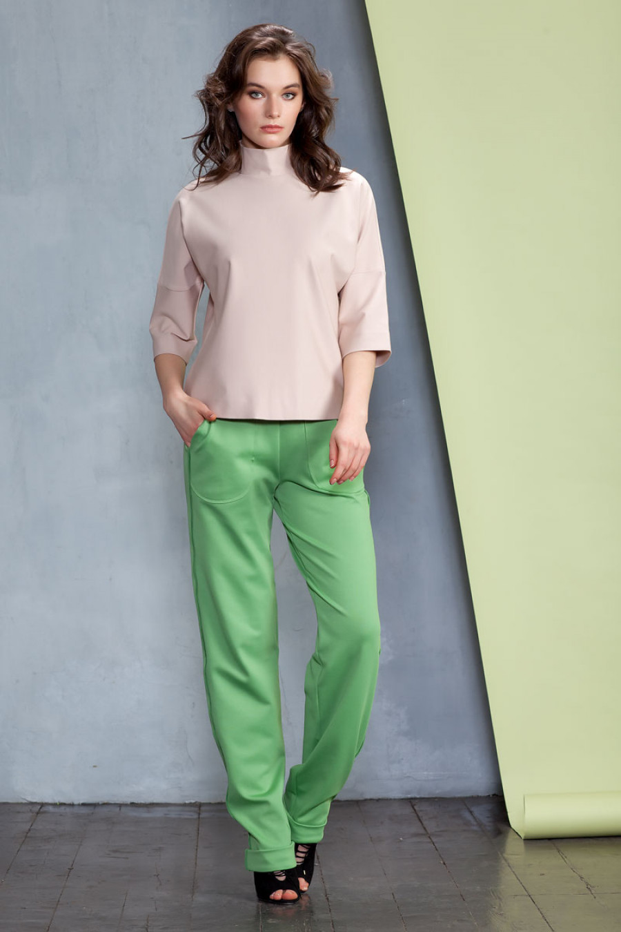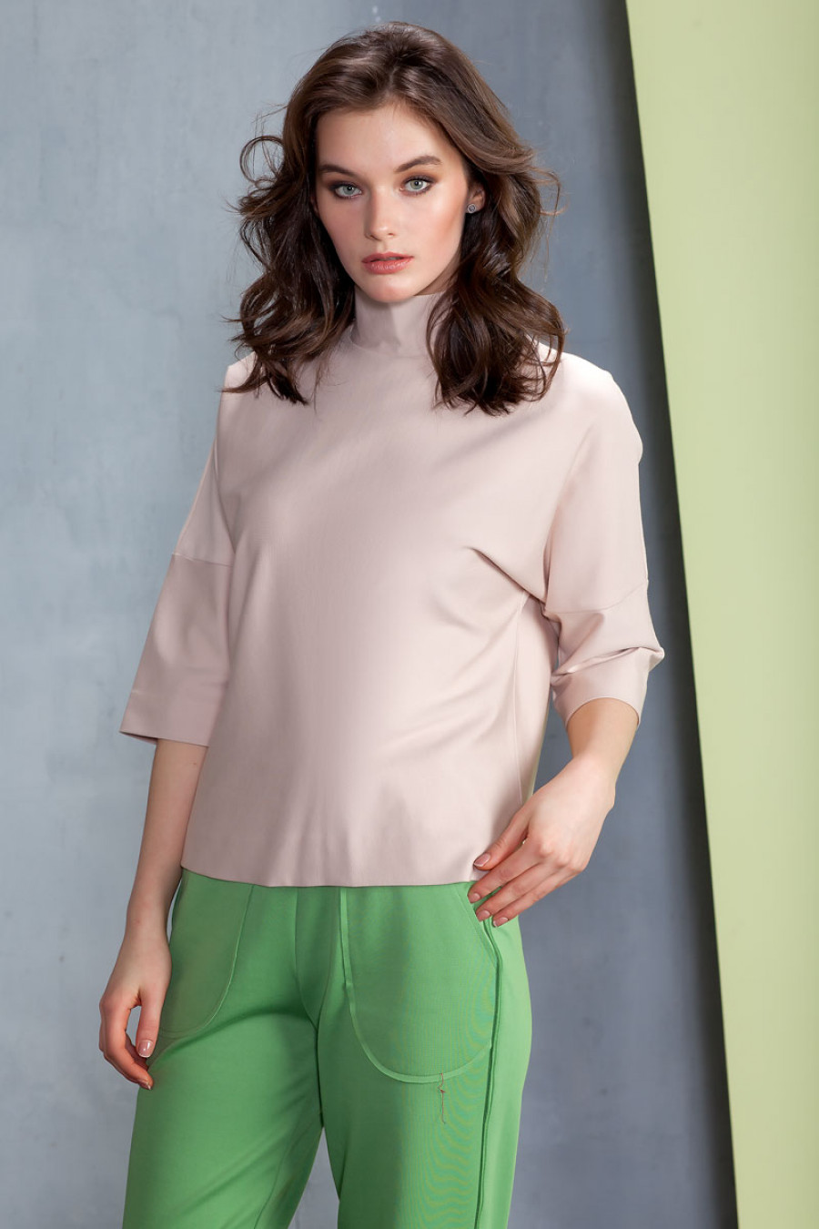 Джемпер прямого силуэта из плотного трикотажа. Модель объемного кроя со спущенным плечом, втачной рукав 3/4. Горловина оформлена воротником-стойкой. Прекрасный вариант на каждый день.