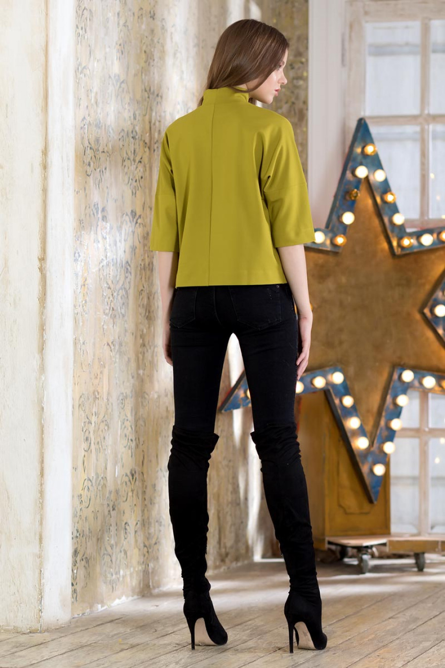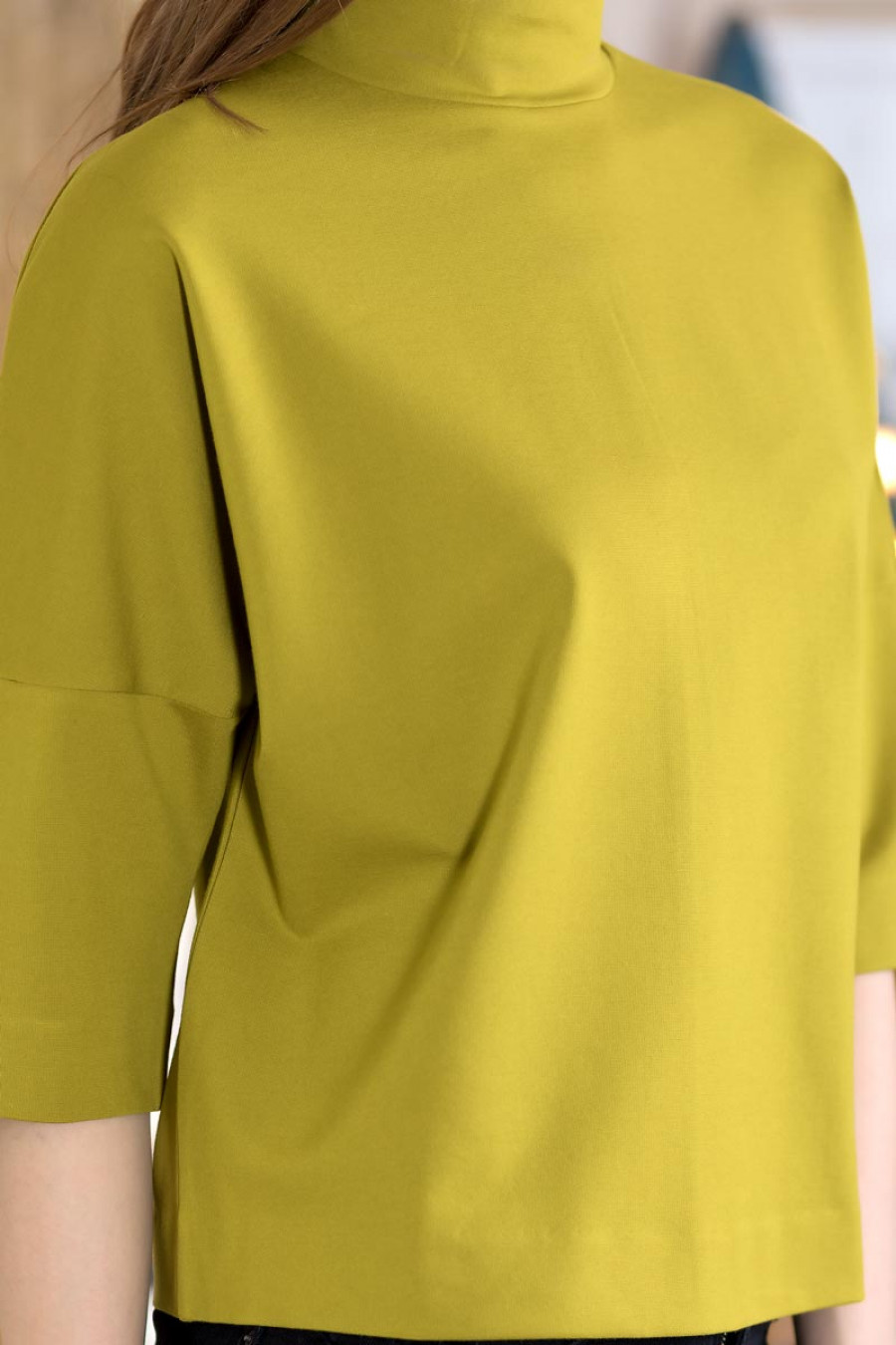 Джемпер прямого силуэта из плотного трикотажа. Модель объемного кроя со спущенным плечом, втачной рукав 3/4. Горловина оформлена воротником-стойкой. Прекрасный вариант на каждый день.