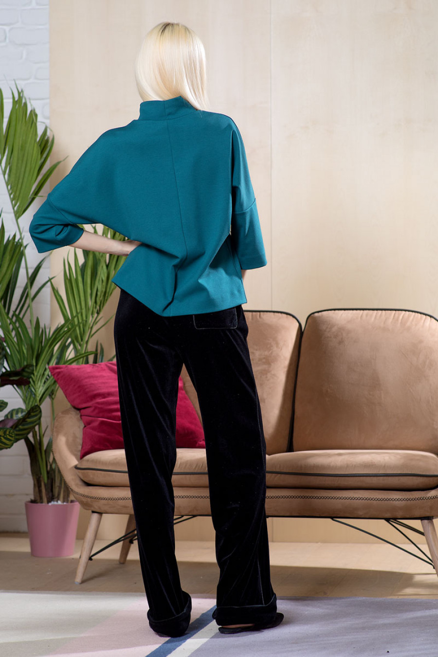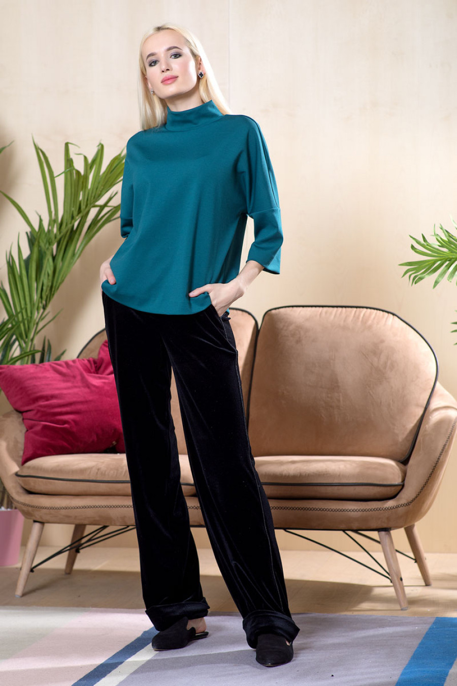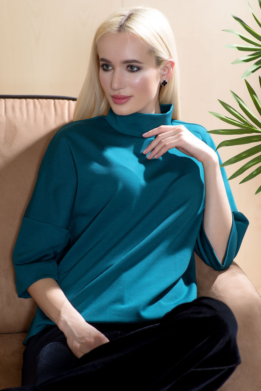 Джемпер прямого силуэта из плотного трикотажа. Модель объемного кроя со спущенным плечом, втачной рукав 3/4. Горловина оформлена воротником-стойкой. Прекрасный вариант на каждый день.