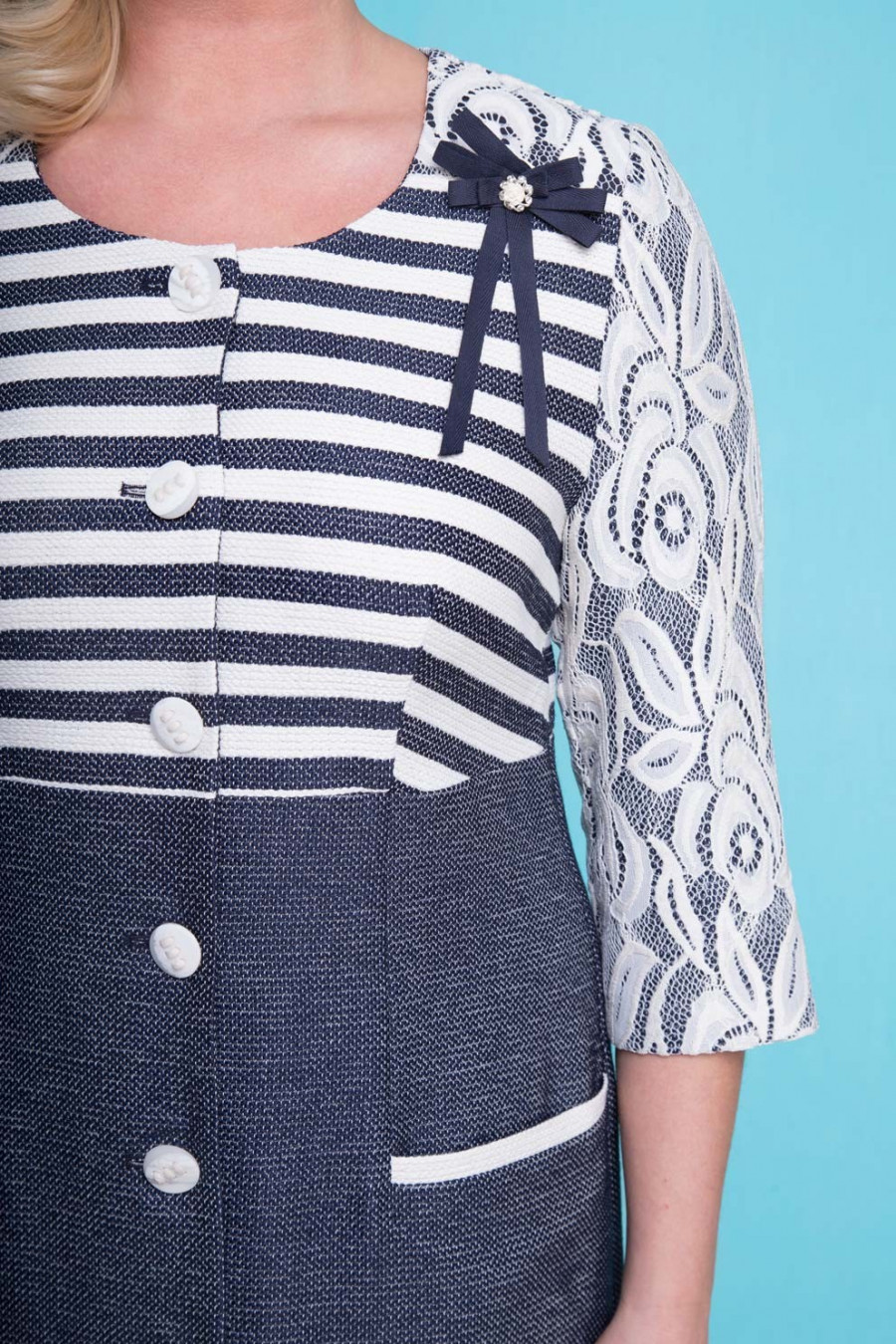 Кардиган женский, ArtRibbon, полуприлегающего силуэта из платьево-костюмной ткани с кружевной отделкой, настроченной на льняную ткань (кокетки и рукава). Кардиган отрезной по линии талии. Лиф переда и спинки с плечевыми кокетками и талевыми вытачками. По нижней части переда обработаны подрезы, в которых обработаны карманы с листочкой. По нижней части спинки обработаны талевые вытачки и средний шов, который заканчивается функциональной шлицей. Застежка центральная, бортовая на петли и пуговицы.