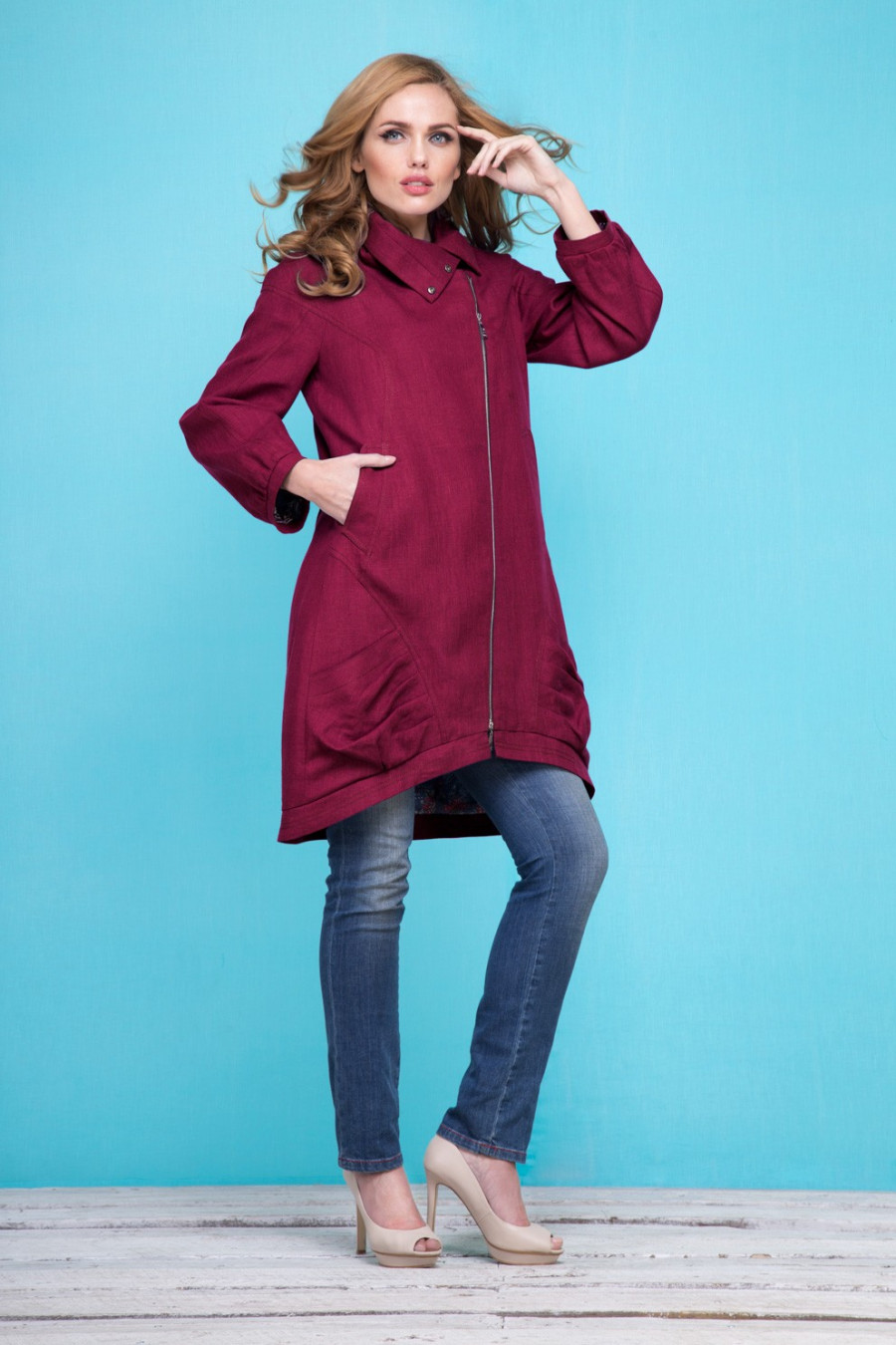 Кардиган женский, ArtRibbon, расширенный к низу из льняной ткани на хлопковой подкладке с цветочным принтом. Застежка косая на тесьму "молния". Перед с фигурными рельефами, в которых обработаны карманы с настрочной листочкой. На отрезных деталях по низу передних частей обработаны карманы со складками. Спинка с фигурными рельефами и средним швом. По талии на участке средней части спинки обработана кулиса. Рукав трехшовный, покроя полуреглан до спущенного плеча. Низ рукава присборен на манжету шириной 2,5 см. Воротник стойка шириной 13 см со складками и бейкой по верхнему краю, застегивается по переду на 3 кнопки. Низ изделия фигурный -- перед короче спинки, оформлен отрезной планкой с двумя отделочными строчками по центру. По рельефам переда, спинки и рукава проложены двойные отделочные строчки, ш.ш. 0,2;0,7 см.