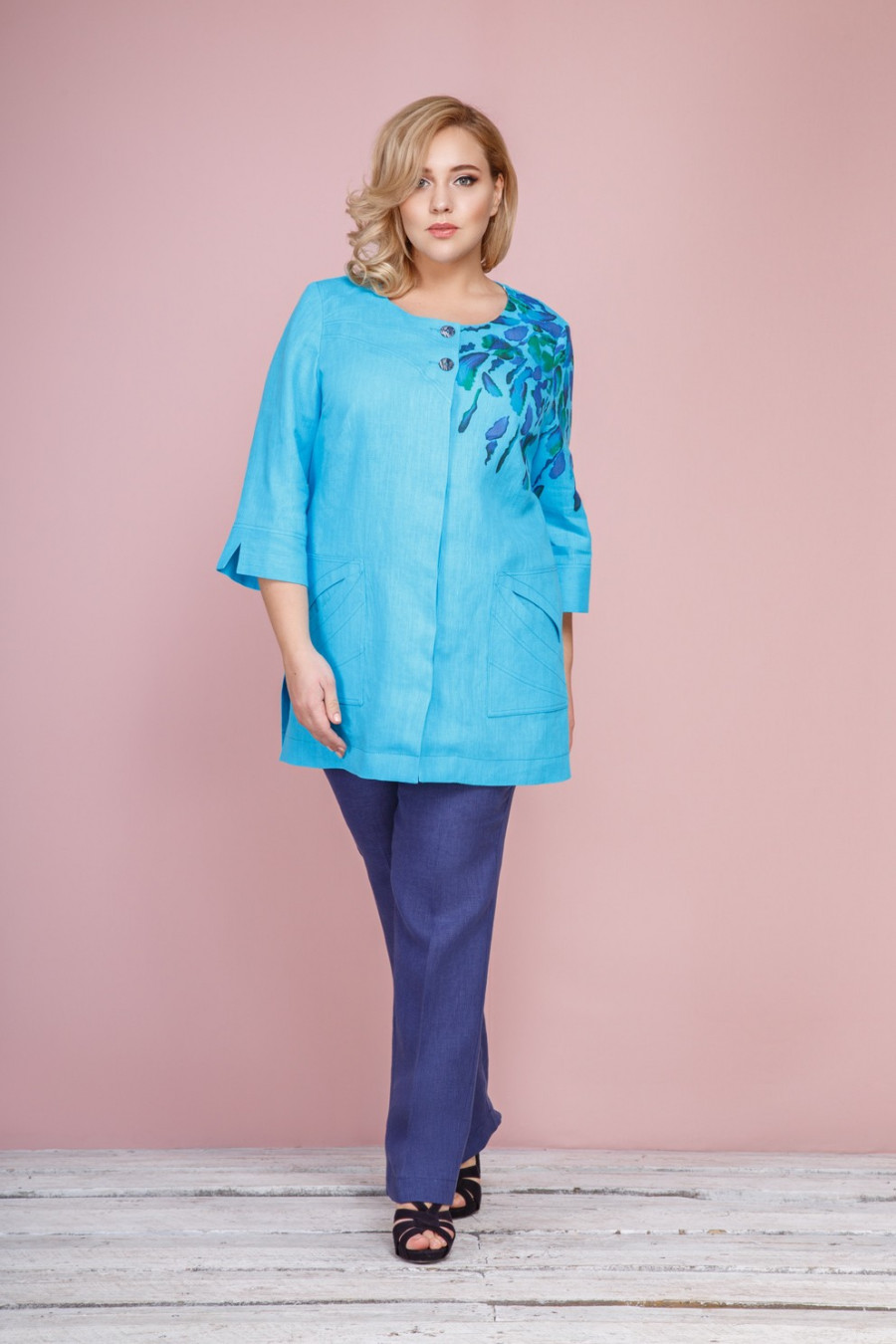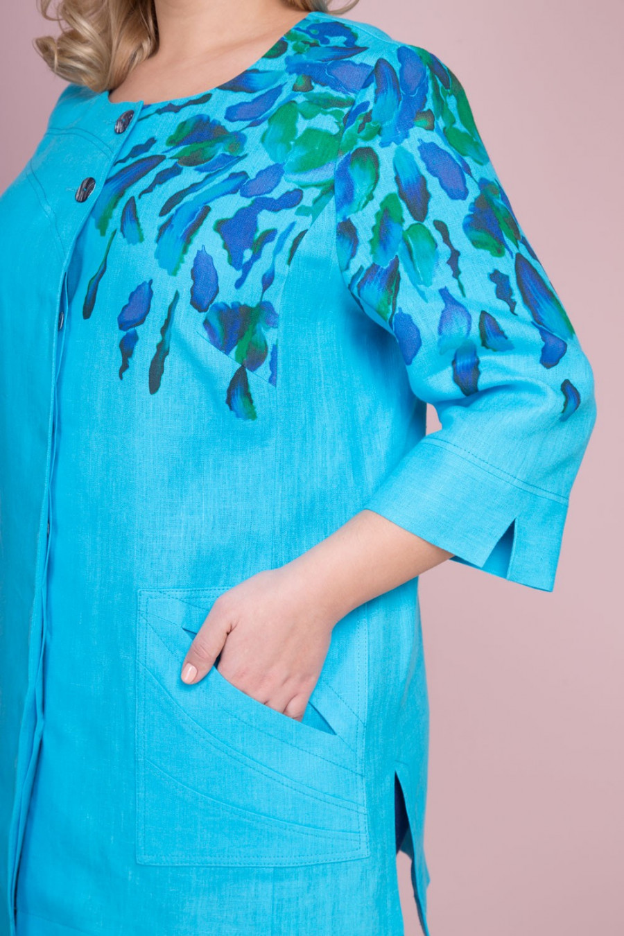 Кардиган женский Art ribbon, полуприлегающего силуэта из льняной ткани. По переду центральная бортовая застежка на потайной планке с петлями и пуговицами. По переду обработаны рельефные швы, нагрудные вытачки, накладные карманы. По горловине правой части переда обработаны фигурные кокетки, по левой части - выполнена декоративная печать. Спинка со средним швом. Рукава втачные, длиной три четверти, низ рукавов с притачными манжетами, манжеты рукавов с разрезами.