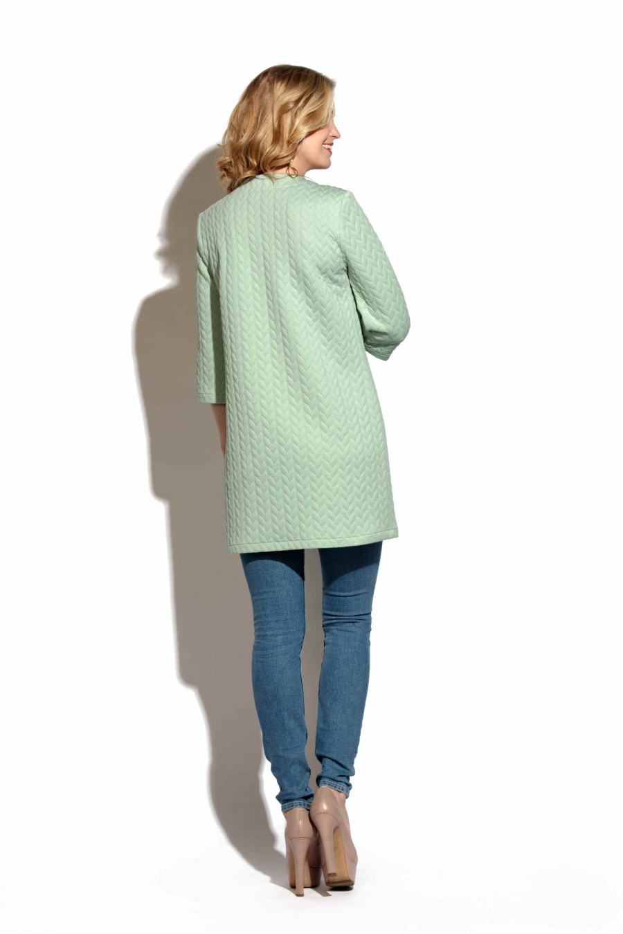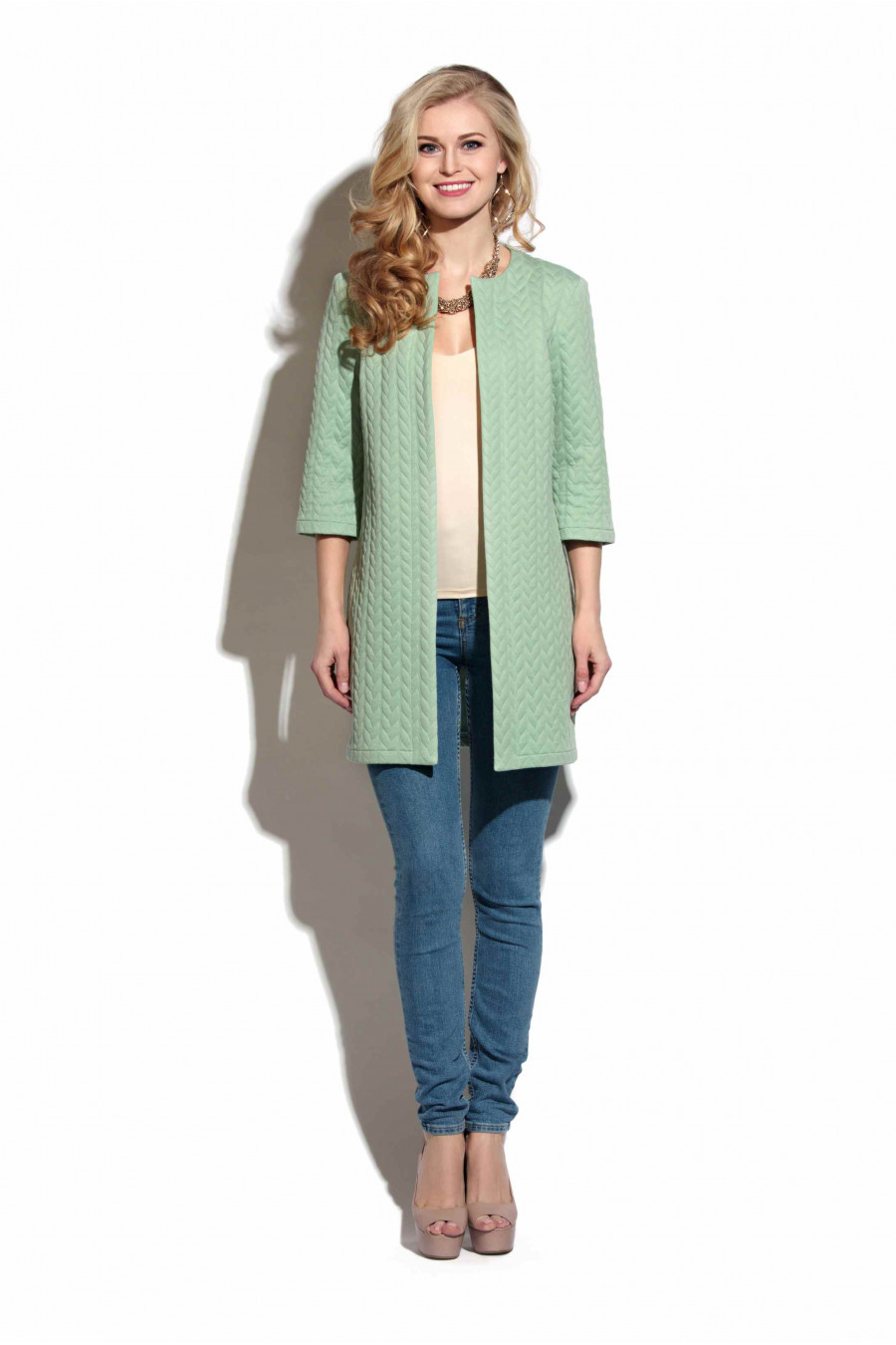 Кардиган полуприлегающего силуэта из плотного рельефного трикотажа с имитацией рисунка «косы». Модель кардигана слегка приталена благодаря боковым швам. Вырез горловины круглый, не глубокий. Рукав одношовный втачной, длина – ¾. Использование ткани с оригинальной отделкой придает кардигану неповторимый эффект шика.