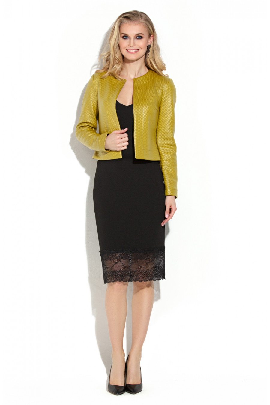 Кардиган из стеганого плотного трикотажа. Модель кардигана в стиле «шанель» слегка приталена. На полочке вытачки. Вырез горловины круглый, не глубокий. Рукав длинный двухшовный. Горловина и подборт обработаны широкой планкой с отстрочкой.