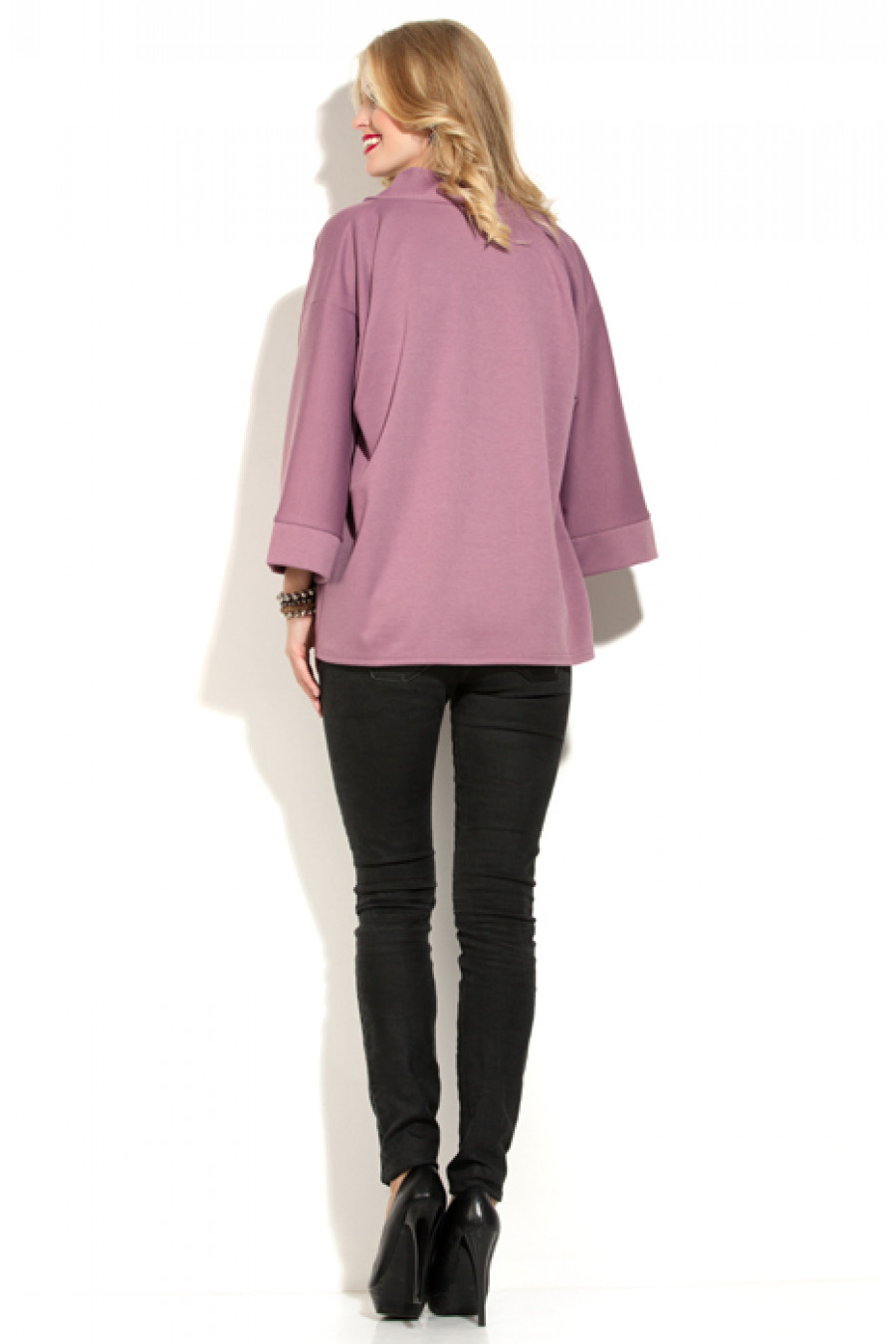 Кардиган из джерси имеет свободный крой кимоно. По горловине спинки и подборту широкая планка. Рукав 3/4. По низу рукава– манжеты. Длина: 64 см.