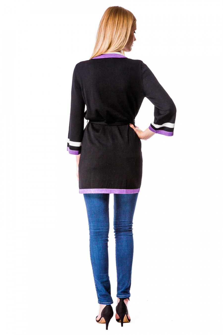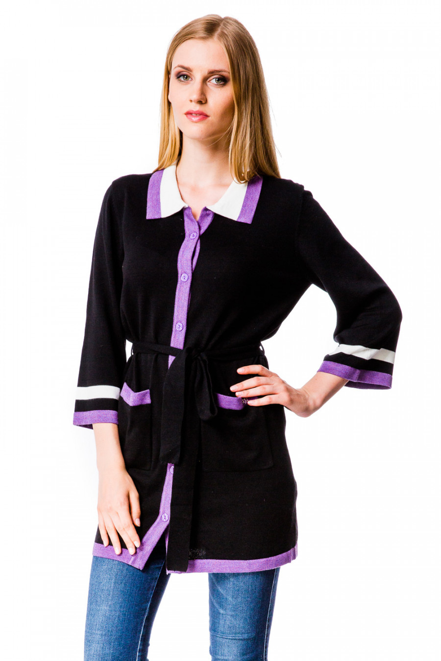Модный кардиган свободного покроя под пояс. Модель удлиненного типа с отложным воротником и рукавами 3/4. Застежка на пуговицы. Накладные карманы. Модель выполнена из плотной вязки и декорирована контрастными полосками по краю изделия. Оригинальная модель прекрасно подойдет для завершения образа.