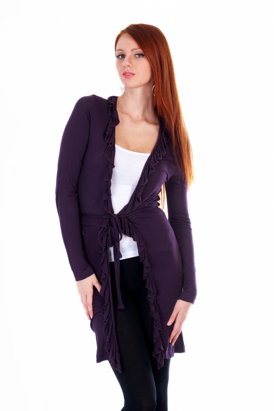 Великолепный кардиган приталенного покроя c длинными рукавами. Изделие имеет вшитый пояс. Модель украшена красивыми оборками по краю. Прекрасно будет сочетаться не только с платьями, но и с брюками.
