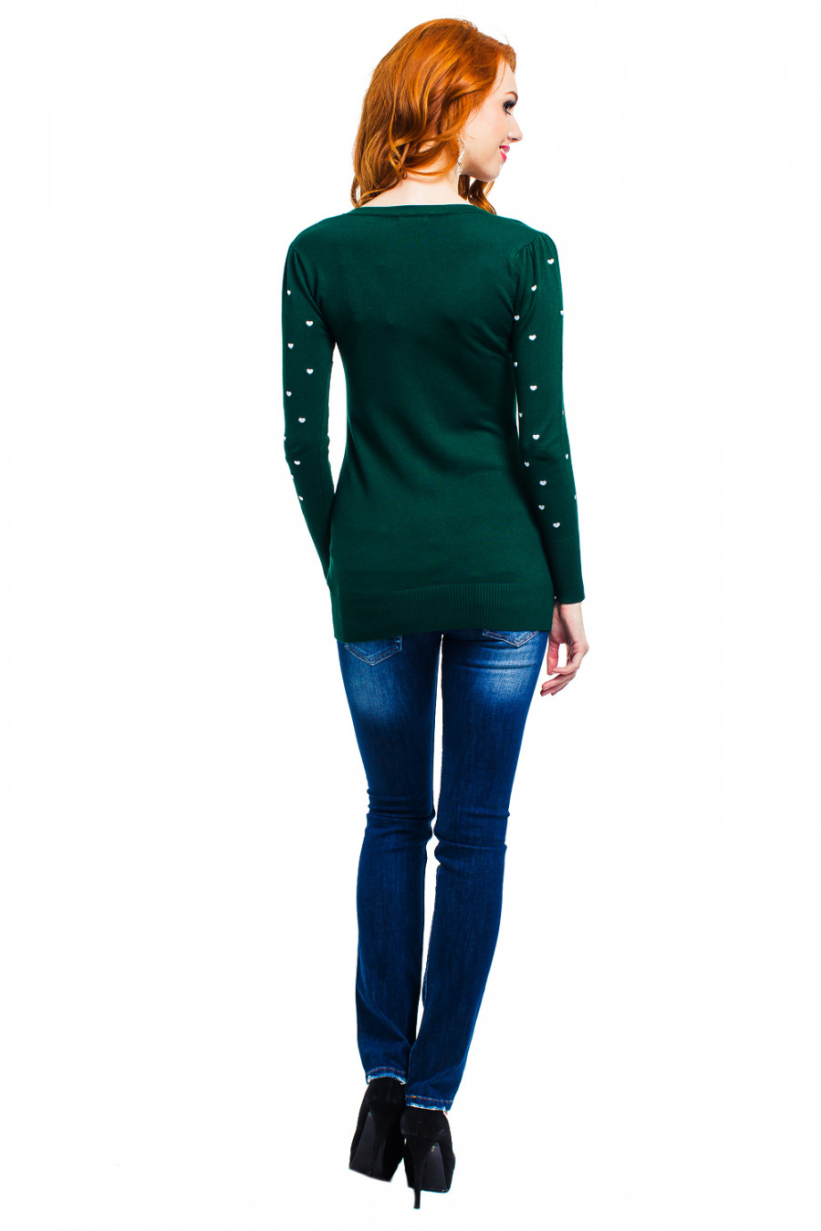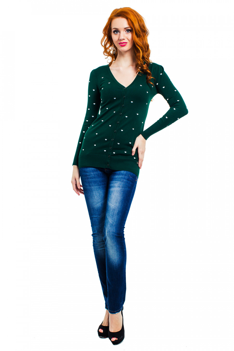 Трендовый приталенный кардиган с V-образным вырезом горловины,все изделие украшено аккуратными вышивками в виде маленьких сердечек. Края изделия выполнены из эластичного материала и окантованы в рубчик. Прекрасное дополнение к леггинсам и джинсам.