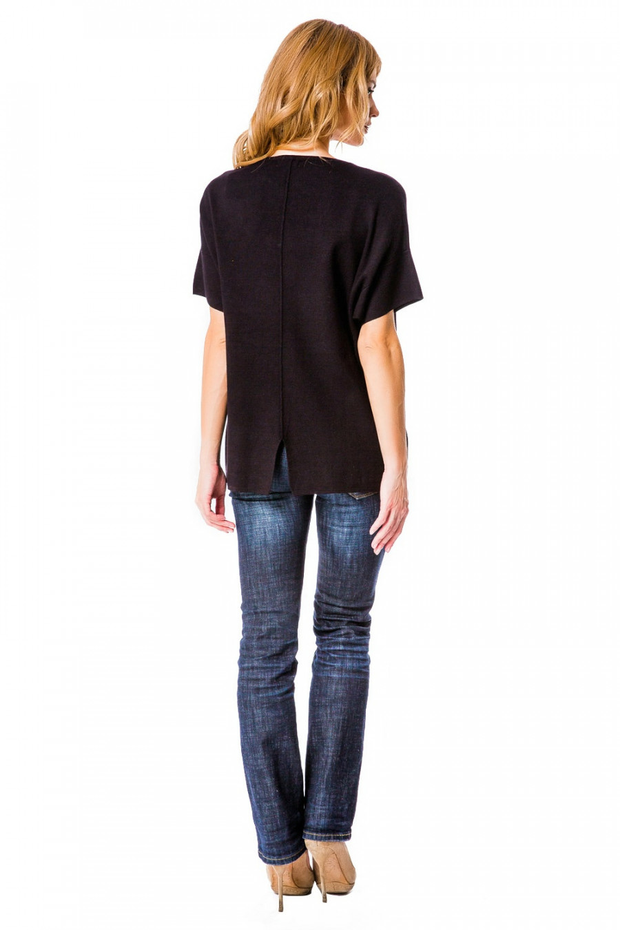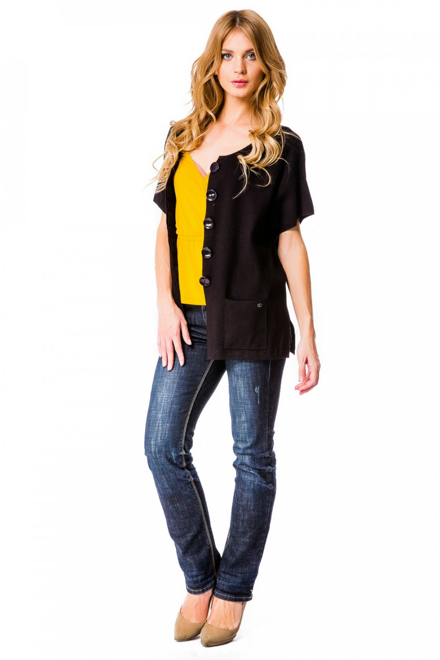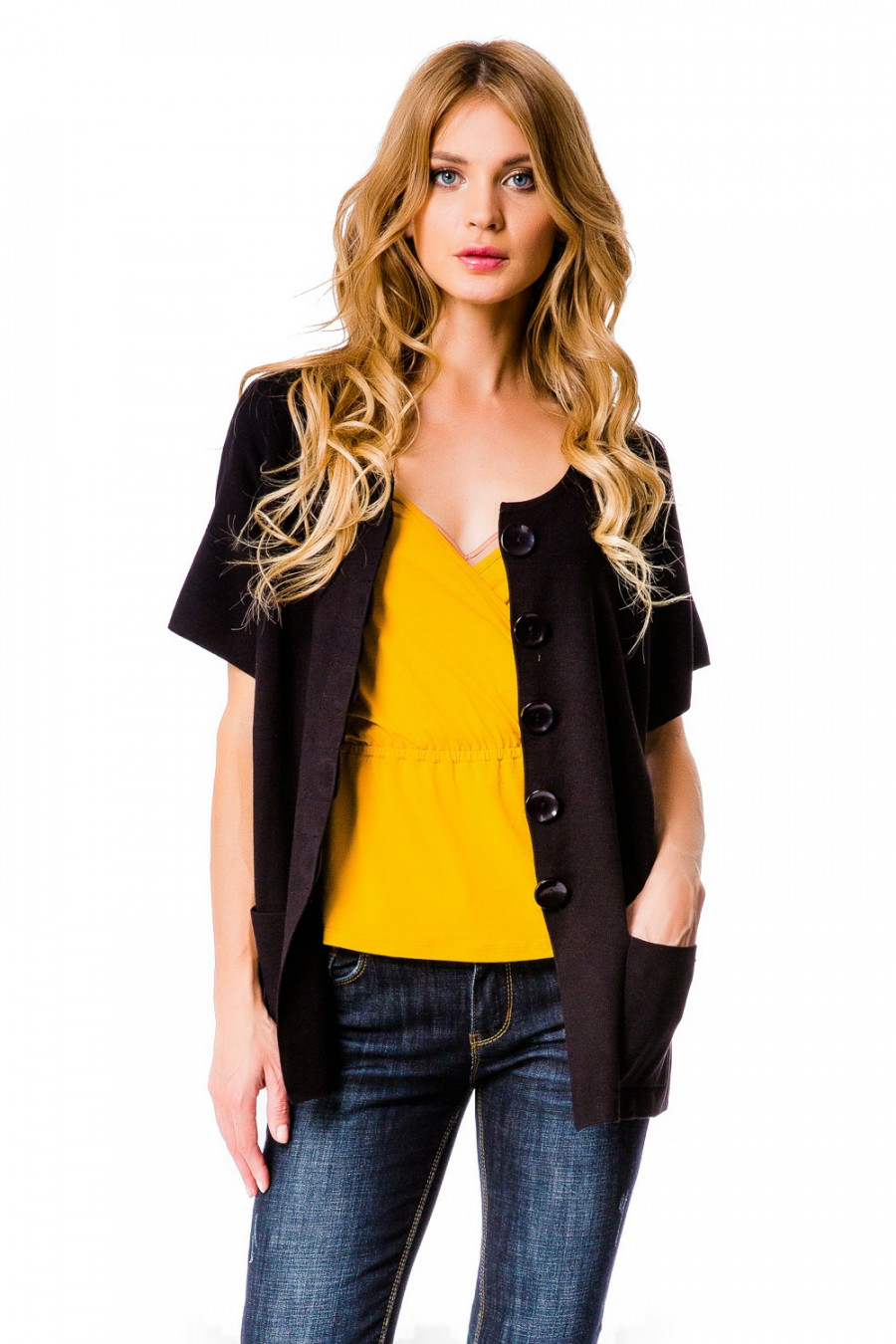 Шикарный кардиган, выполненный из однотонного материала. Модель с короткими рукавами имеет вязаную фактуру. Свободный крой дарит комфорт и уверенность движений. Модель украшена крупными пуговицами в потайном шве и небольшими карманами. Ворот, низ изделия и кайма рукавов окантованы в рубчик. Отличный вариант для женского гардероба.