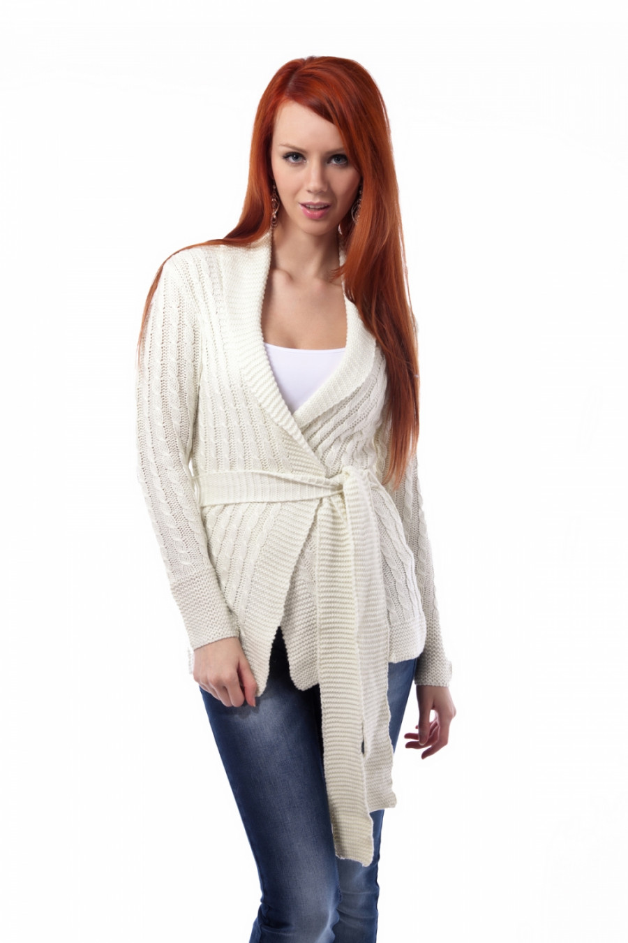 Вязаный удлиненный на запах кардиган с широким поясом. Модель выполнена из плотной и объемной вязки. Купить кардиган можно на нашем сайте по доступной цене.