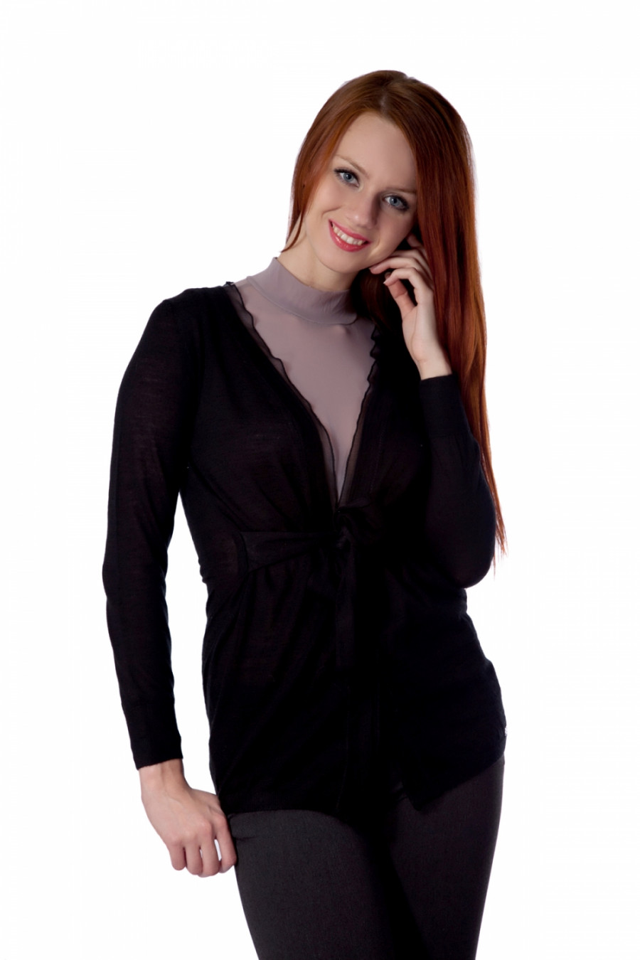 Стильный кардиган с длинным рукавом, края изделия обработаны в два слоя. По бокам у модели имеется пояс, который можно завязать как спереди, так и сзади.