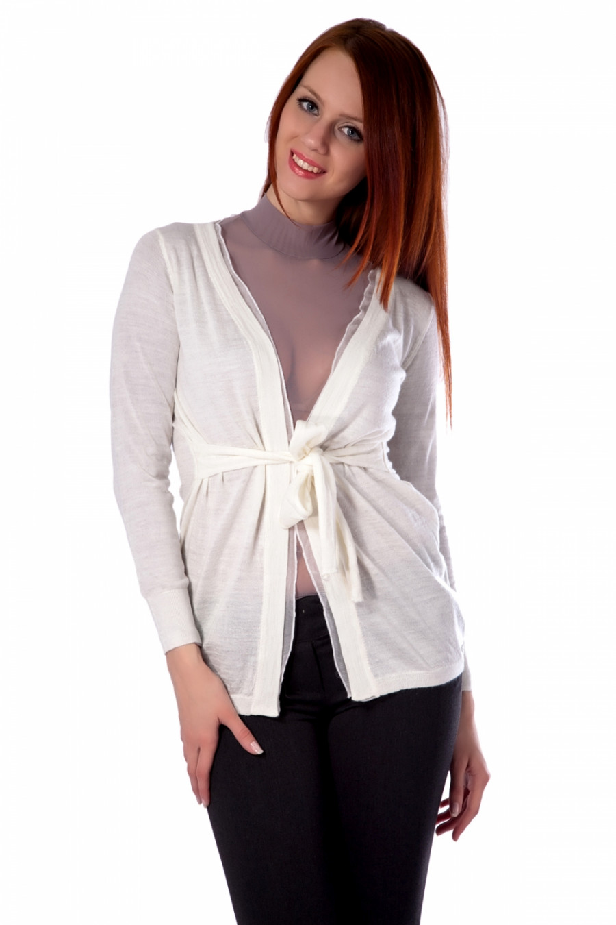 Стильный кардиган с длинным рукавом, края изделия обработаны в два слоя. По бокам у модели имеется пояс, который можно завязать как спереди, так и сзади.
