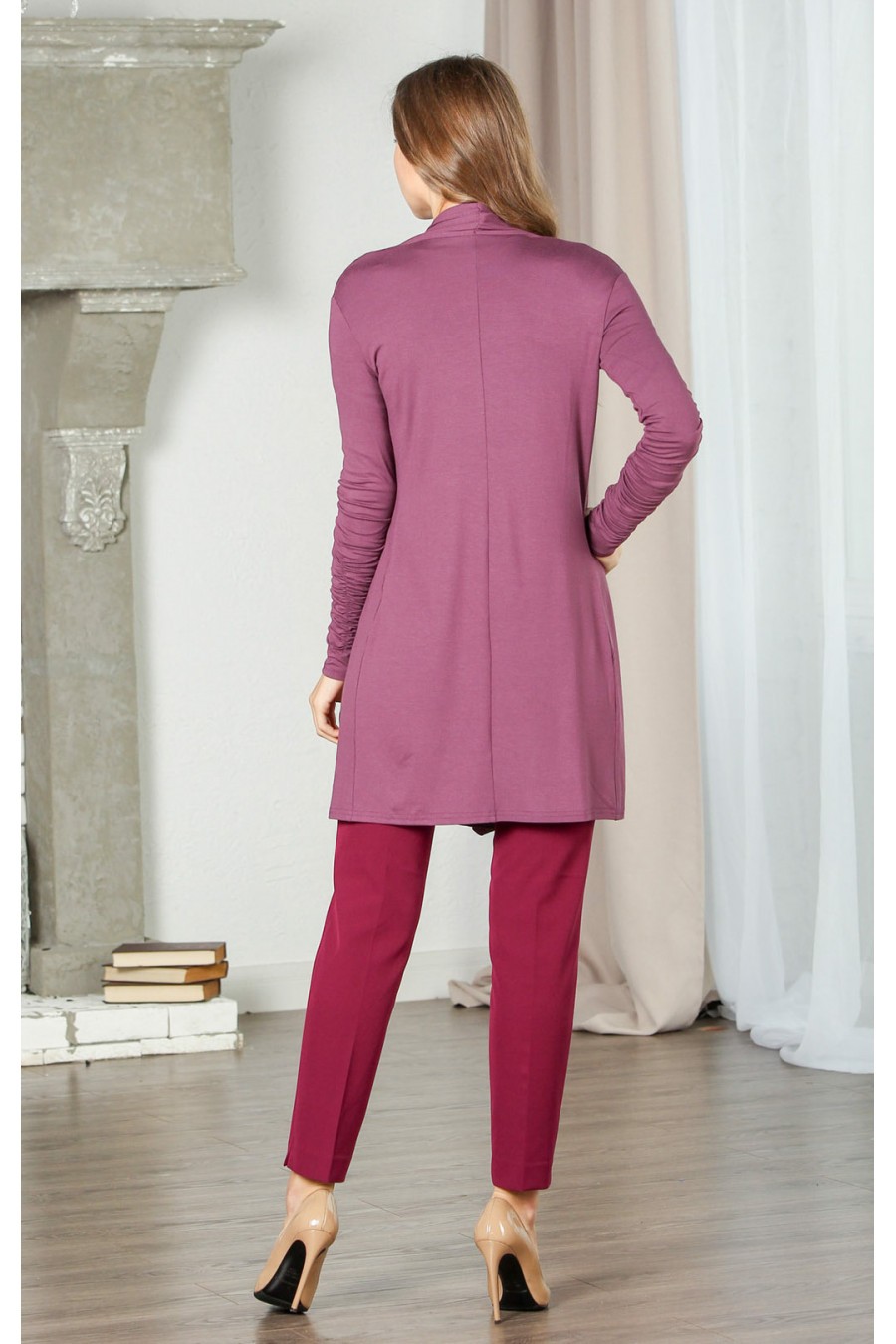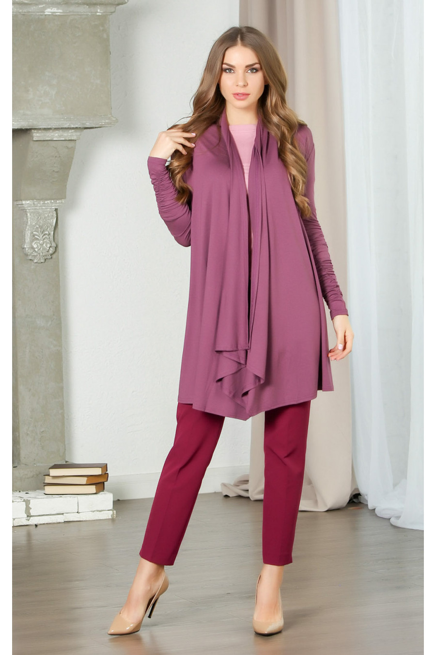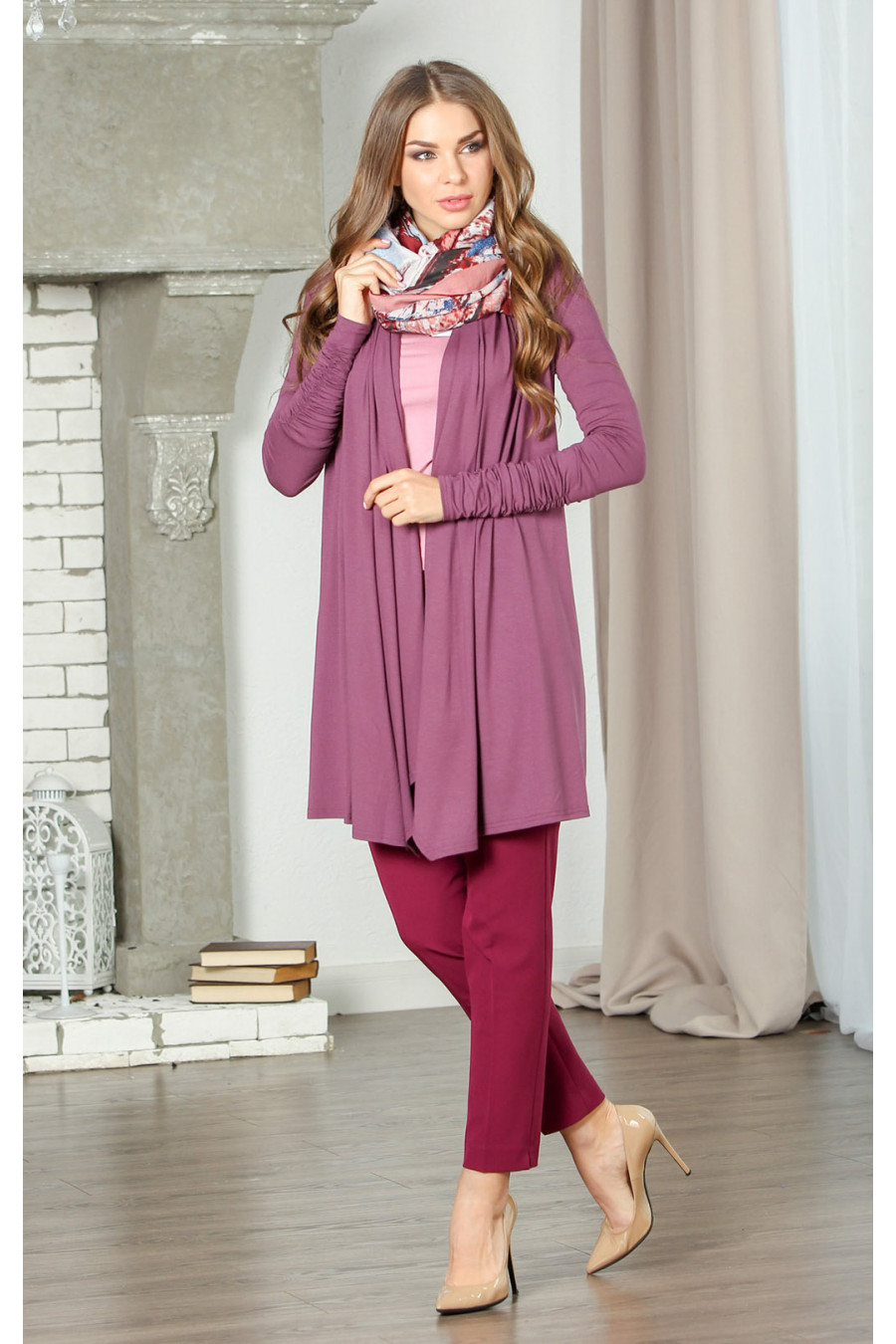 Удлинённый кардиган без застежки с длинным рукавом, драпированным мелкими складками. Отлично сочетается с любыми брюками, джинсами, платьями, юбками и шортами. Главное не забыть подчеркнуть линию талии тонким ремешком, тогда ассиметричные полы кардигана будут смотреться женственно и гармонично.