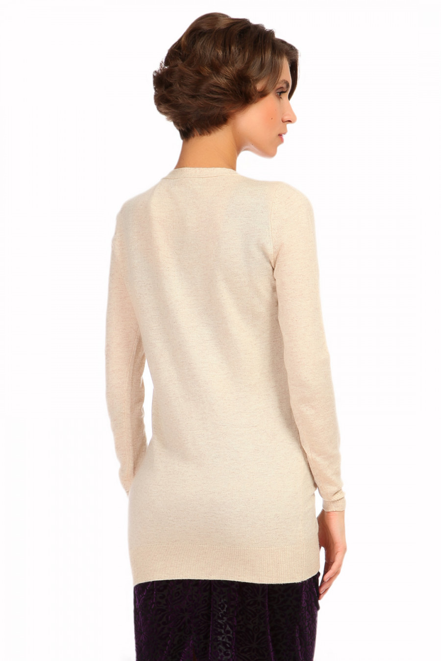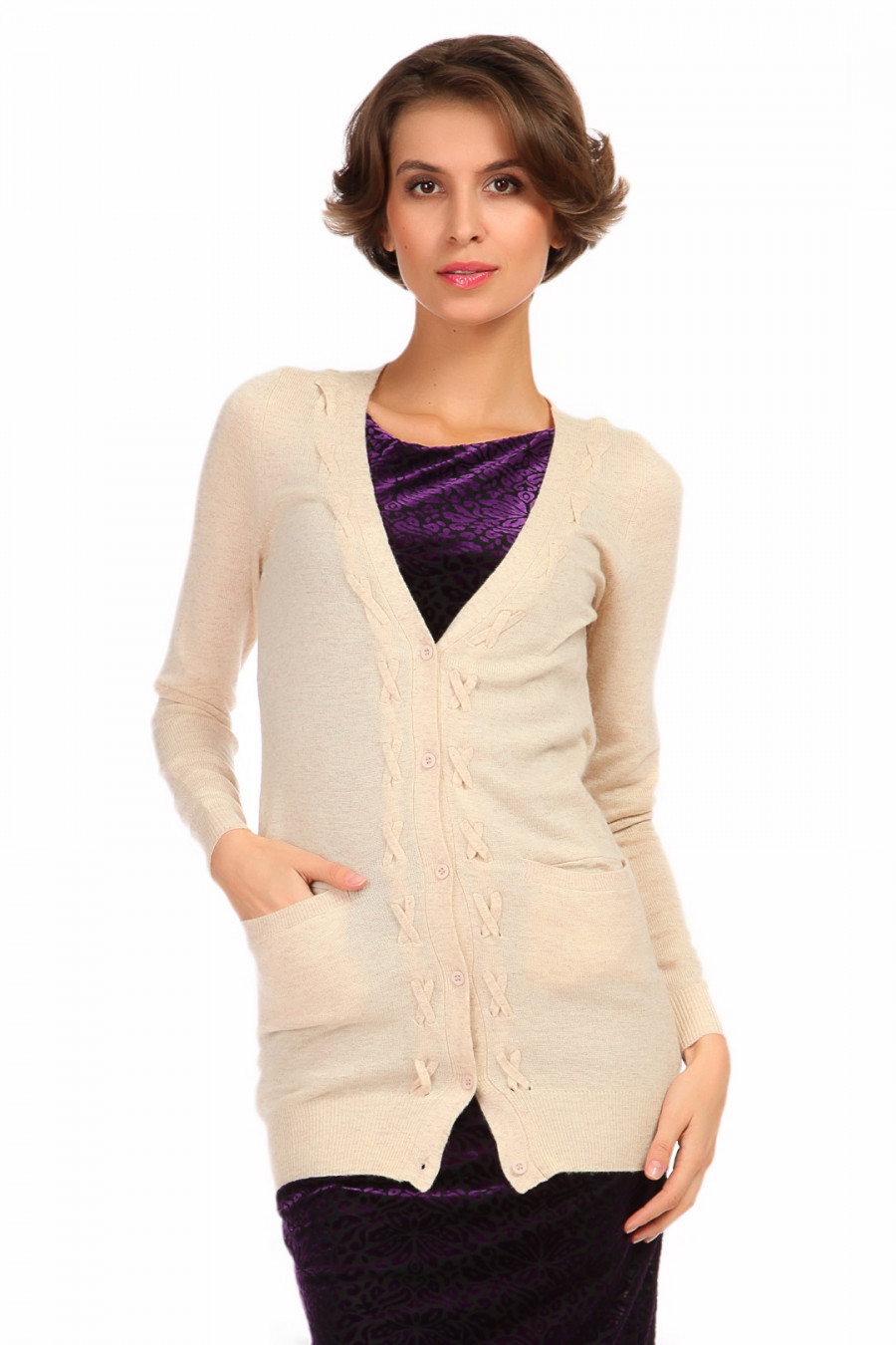 Однотонный классический кардиган, неотъемлемая часть женского гардероба. Мягкий и приятный на ощупь трикотаж из смесовой пряжи с добавлением ангоры .Не слишком глубокий V –вырез в зоне декольте, Передние полочки украшены плетением в форме косичек , имеется два функциональных кармана . Низ изделия и манжеты рукавов завершает резинка.