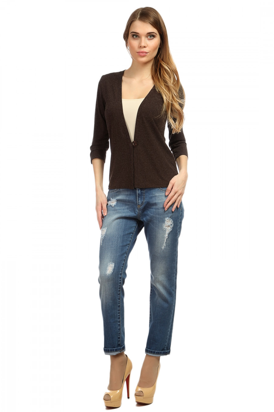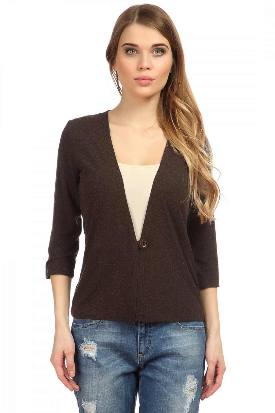 Короткий кардиган с длинным рукавом на одной пуговке.