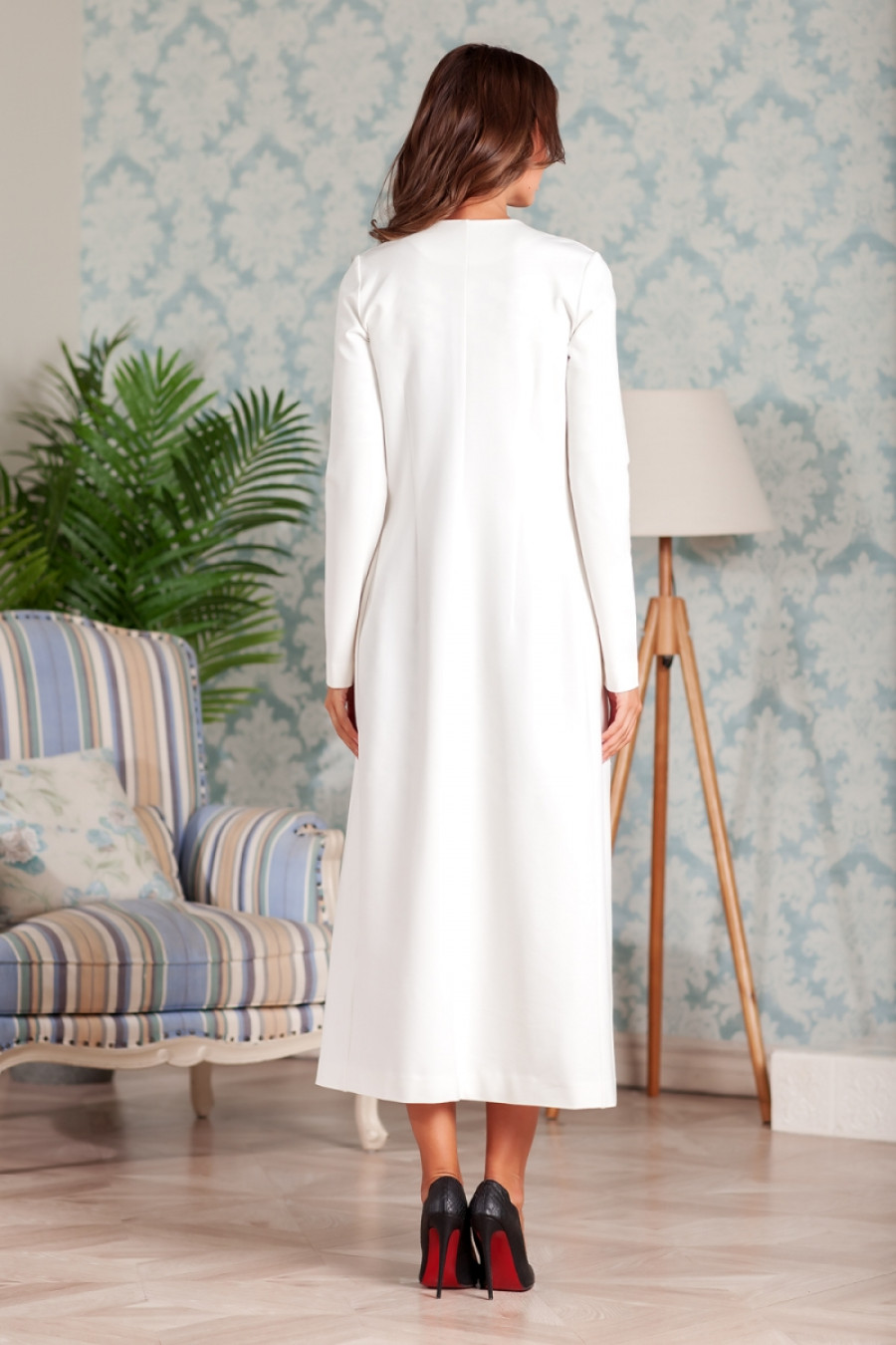 Элегантный и стильный кардиган из плотного джерси. Модель А-силуэта с длинныйм рукавом. Оригинальной деталью являются полочки, переходящие в завязки под грудью. Модель прекрасно сочетается с разными видами одежды.