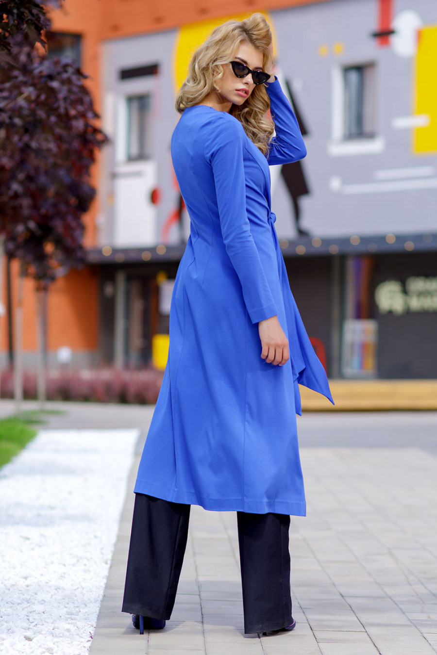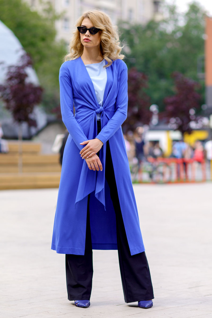 Элегантный и стильный кардиган из мягкого джерси. Модель А-силуэта с длинныйм рукавом. Оригинальной деталью являются полочки, переходящие в завязки под грудью. Модель прекрасно сочетается с разными видами одежды.