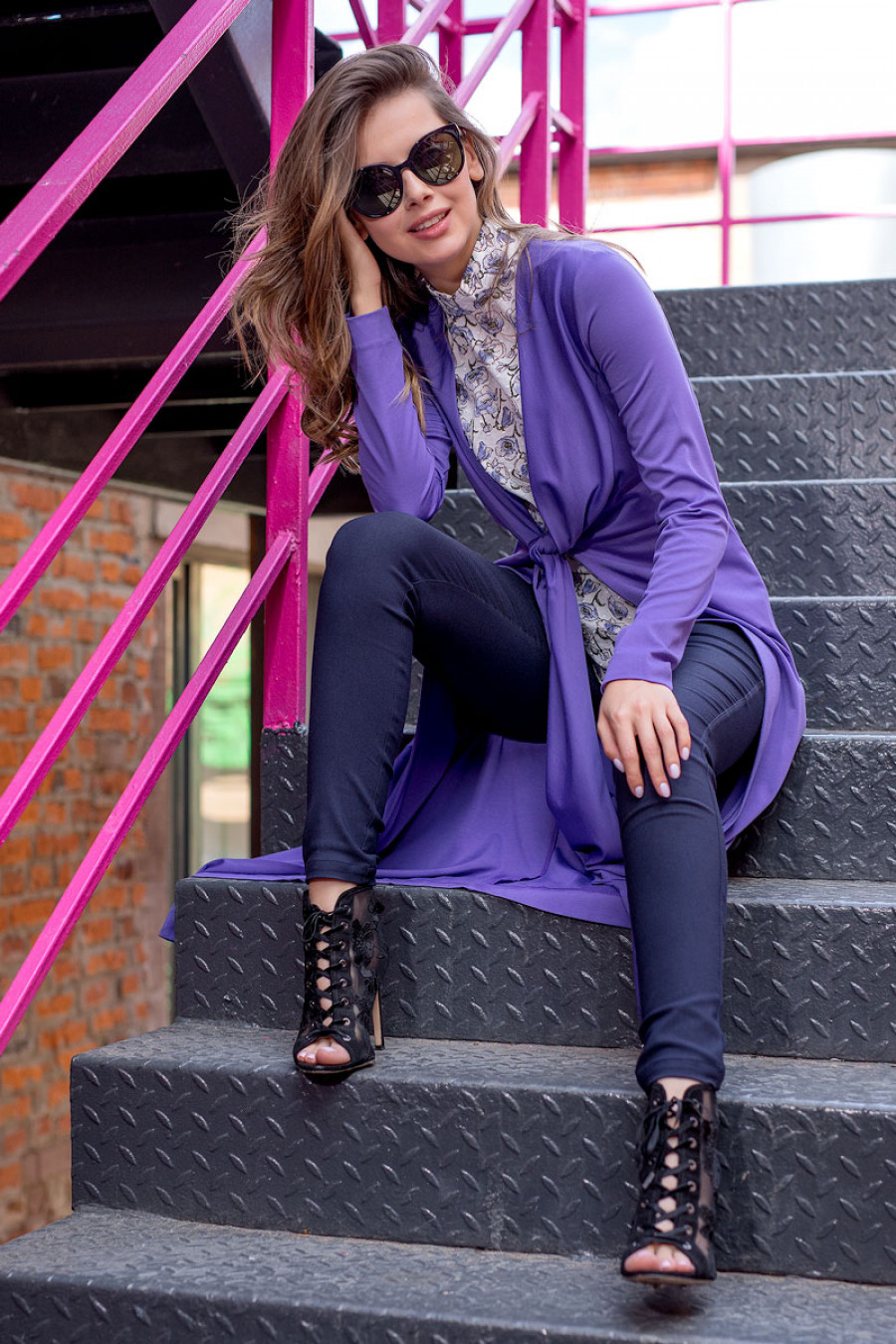 Элегантный и стильный кардиган из мягкого джерси. Модель А-силуэта с длинныйм рукавом. Оригинальной деталью являются полочки, переходящие в завязки под грудью. Модель прекрасно сочетается с разными видами одежды.