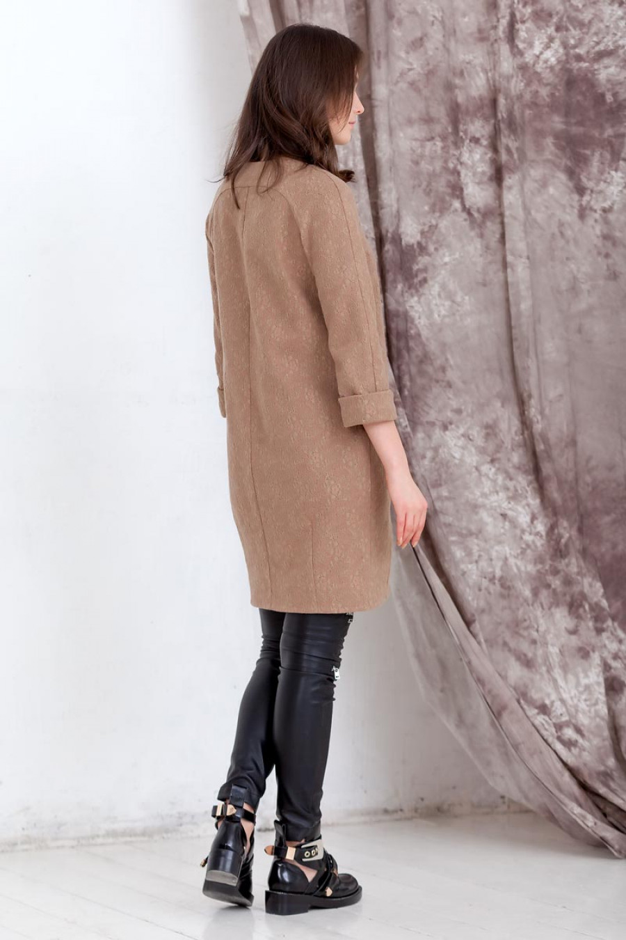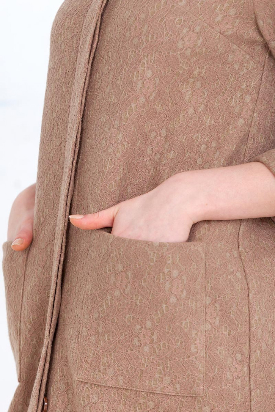 Стильный кардиган из кружевного трикотажного полотна с рукавом реглан 3/4. Впереди и сзади рельефные швы с отстрочкой. Впереди накладные карманы и застежка на пуговицы.