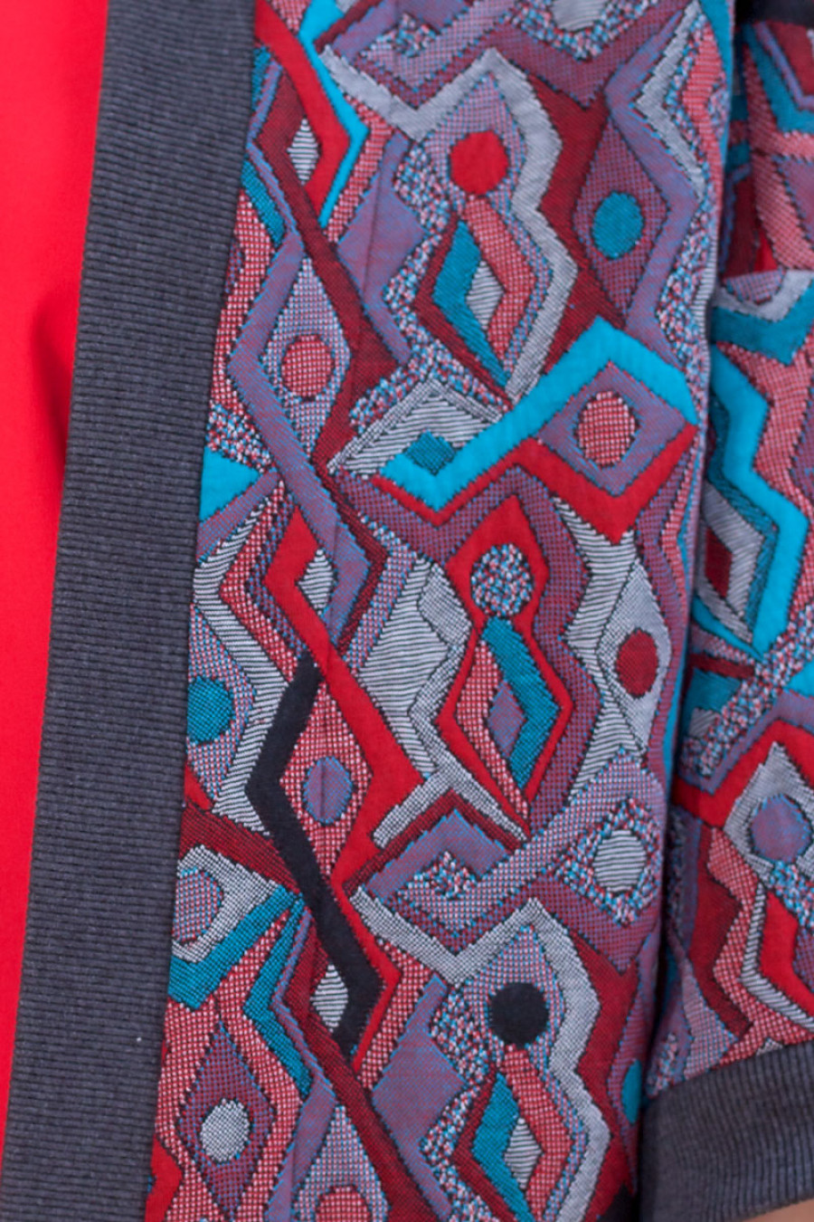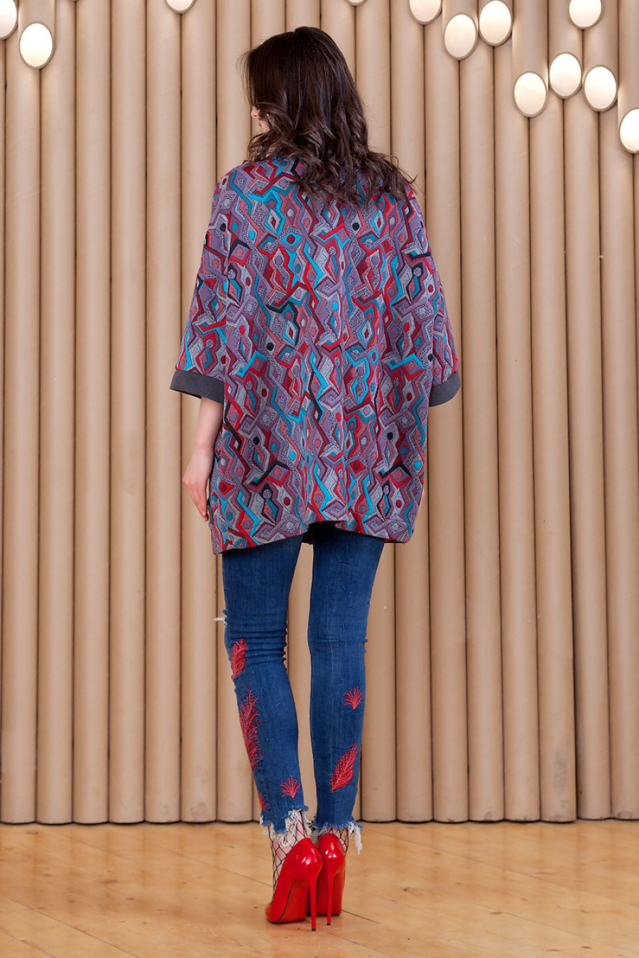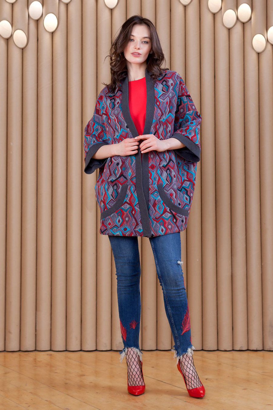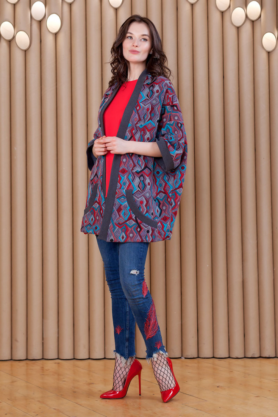 Стильный удлиненный кардиган из плотного трикотажа с фантазийным рисунком. Модель свободного кроя без застежки с рукавом 3/4. Борта полочек, менжеты и планка карманов выполнены из однотонного трикотажа в мелкий рубчик.