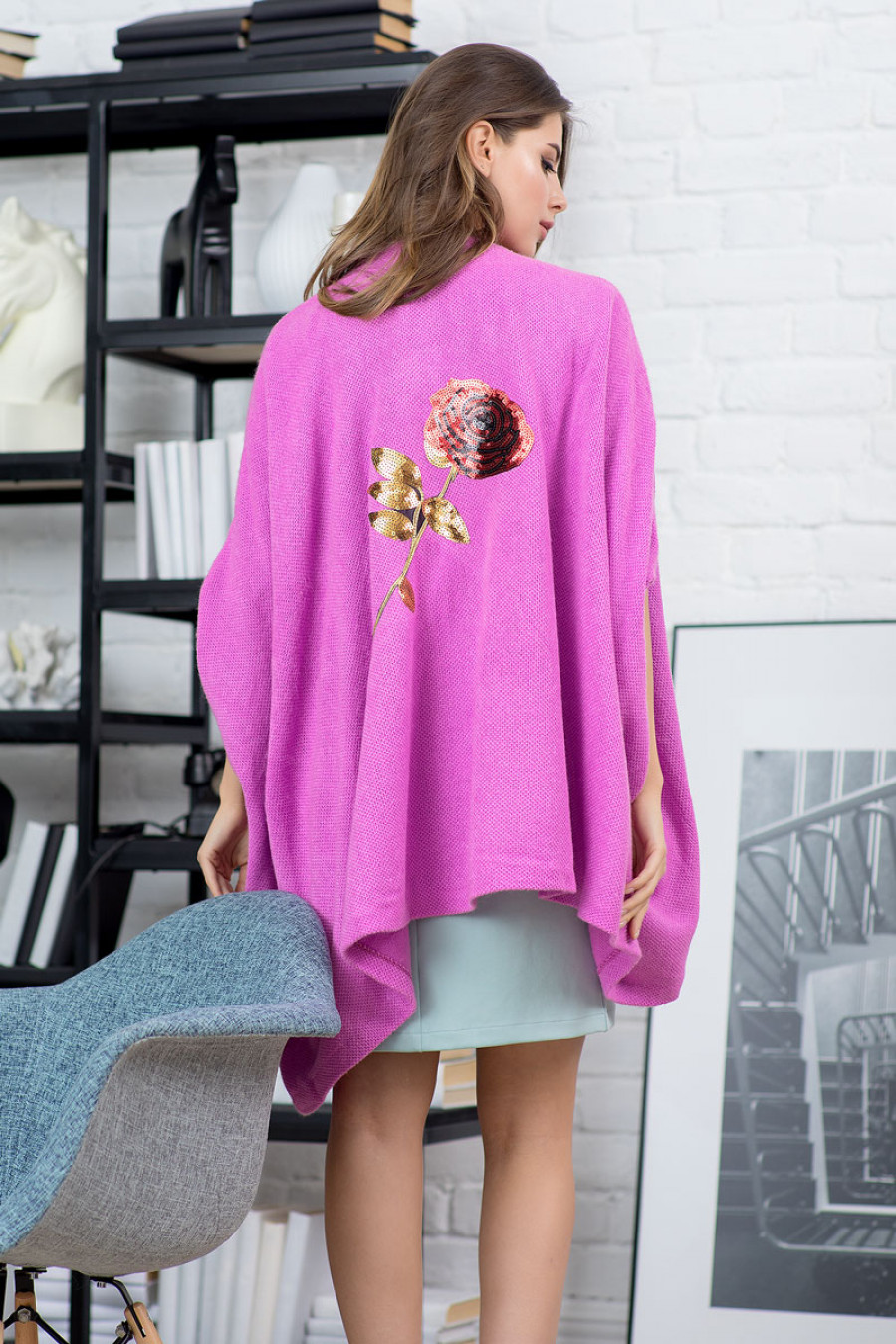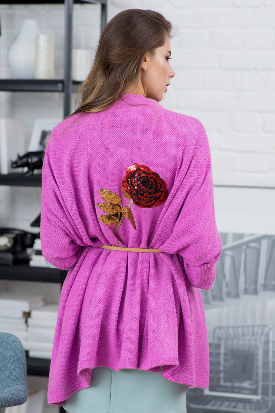 Уютный кардиган из мягкого трикотажа. Модель свободного кроя без застежки. Спереди выполнены карманы с листочкой. Спина украшена аппликацией из пайеток.