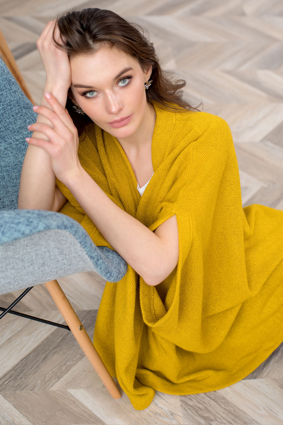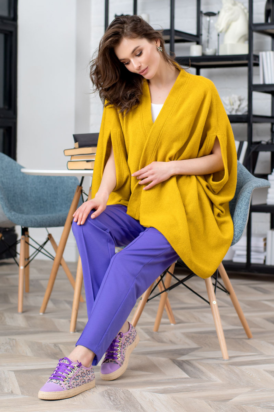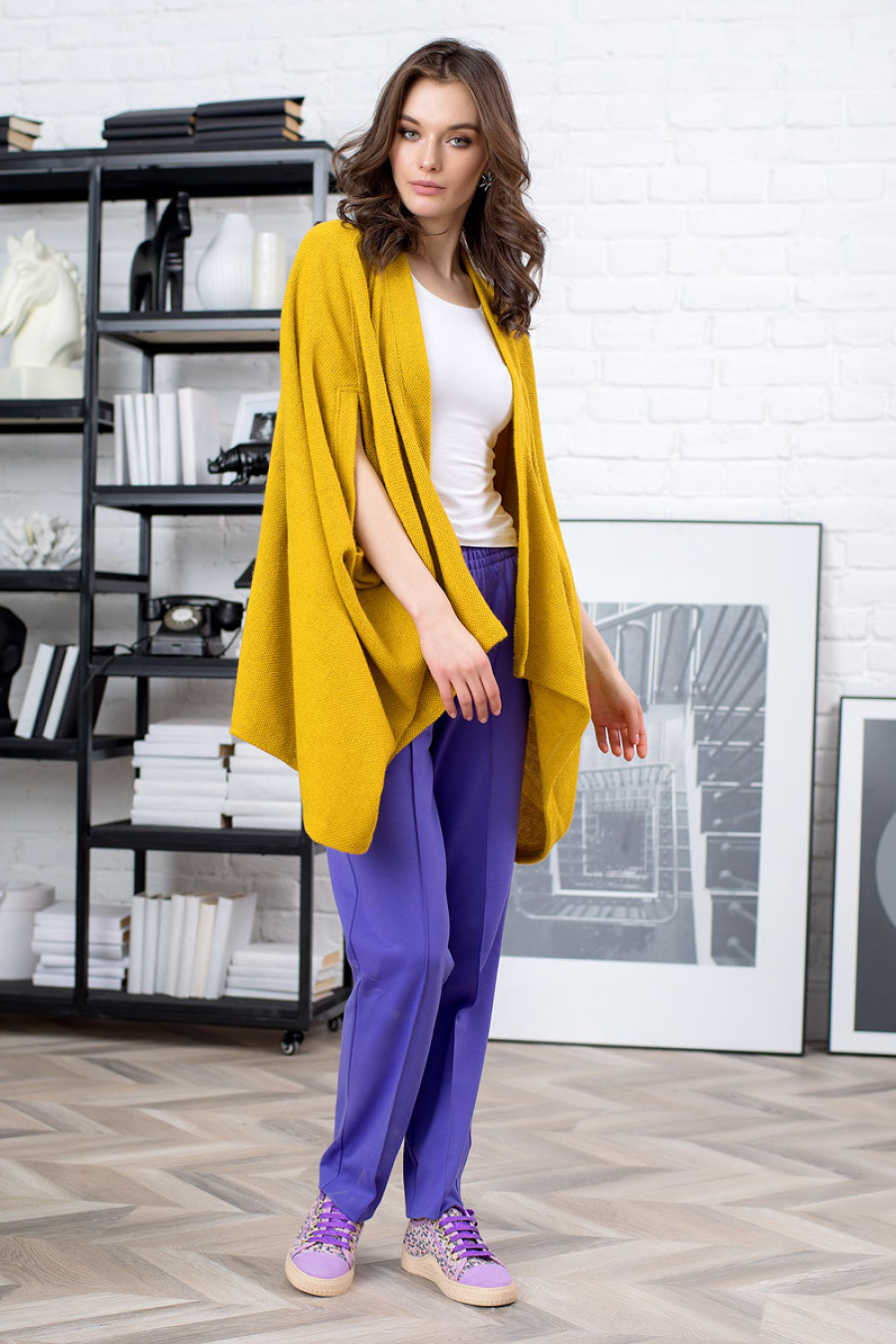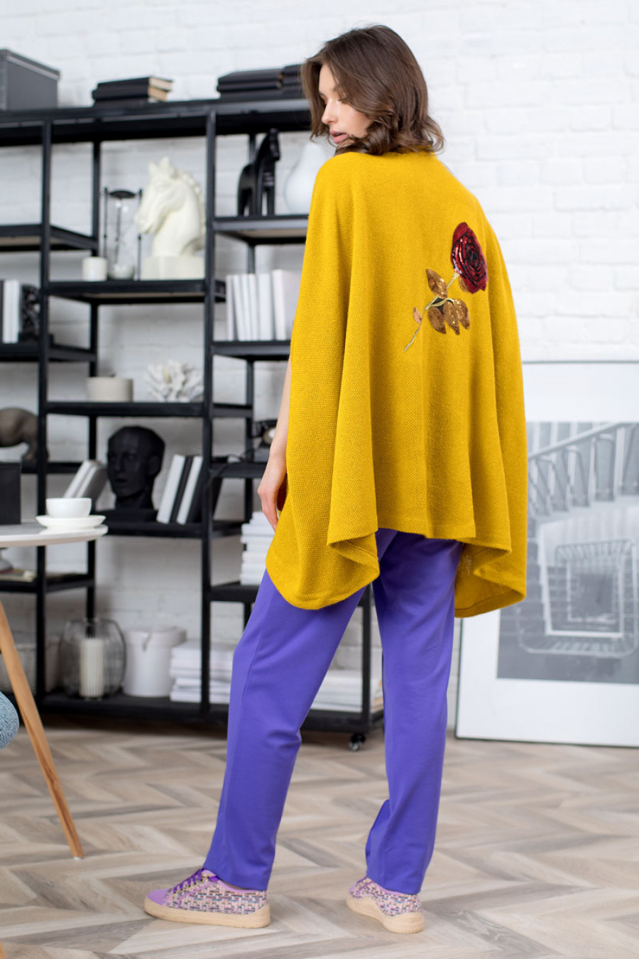 Уютный кардиган из мягкого трикотажа. Модель свободного кроя без застежки. Спереди выполнены карманы с листочкой. Спина украшена аппликацией из пайеток.