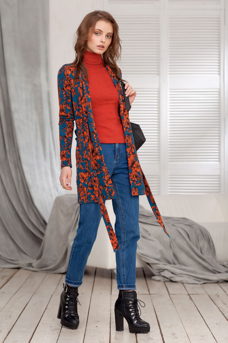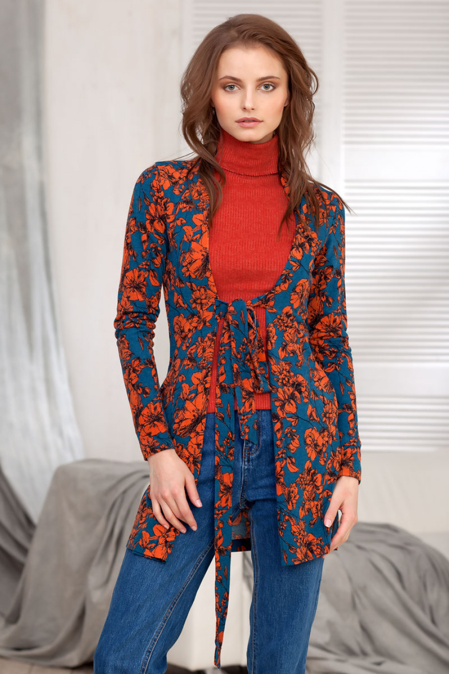 Кардиган с цветочным принтом. Фиксируется завязкой на уровне груди.