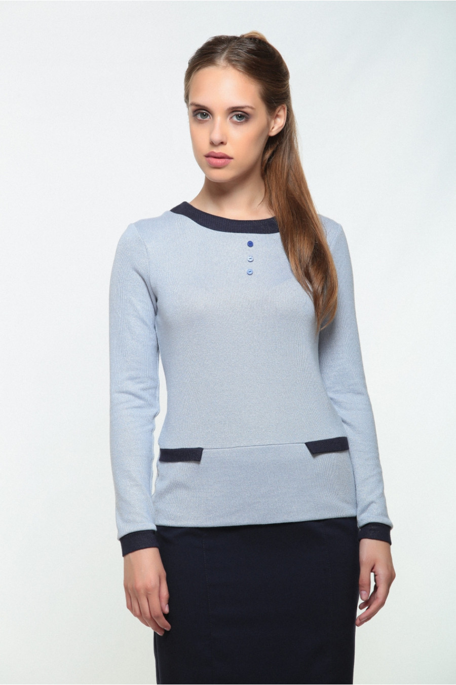 Стильный джемпер с контрастными манжетавми, воротником и карманами будет идеально подходить и к брюкам, и к джинсам, и к юбкам
